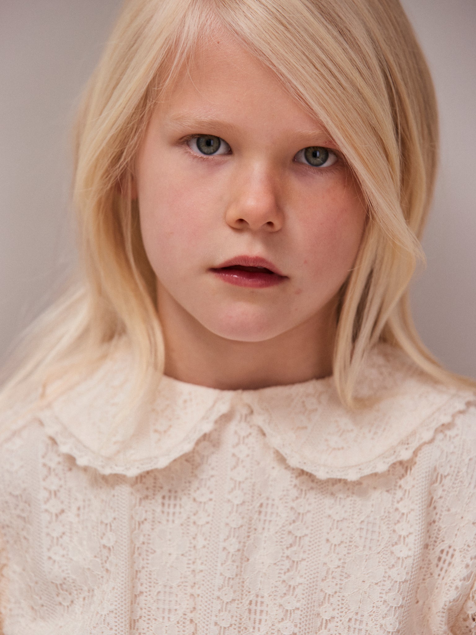 Otillie is a stunning girls dress cut in a lovely cotton lace. The a cute peter pan collar and cuffs are both trimmed with a delicate lace trim. The black gross grain tape belt is a striking contrast making it easy to style with black tights and shoes for the cooler months. Otillie is the perfect party dress for the festive celebrations!