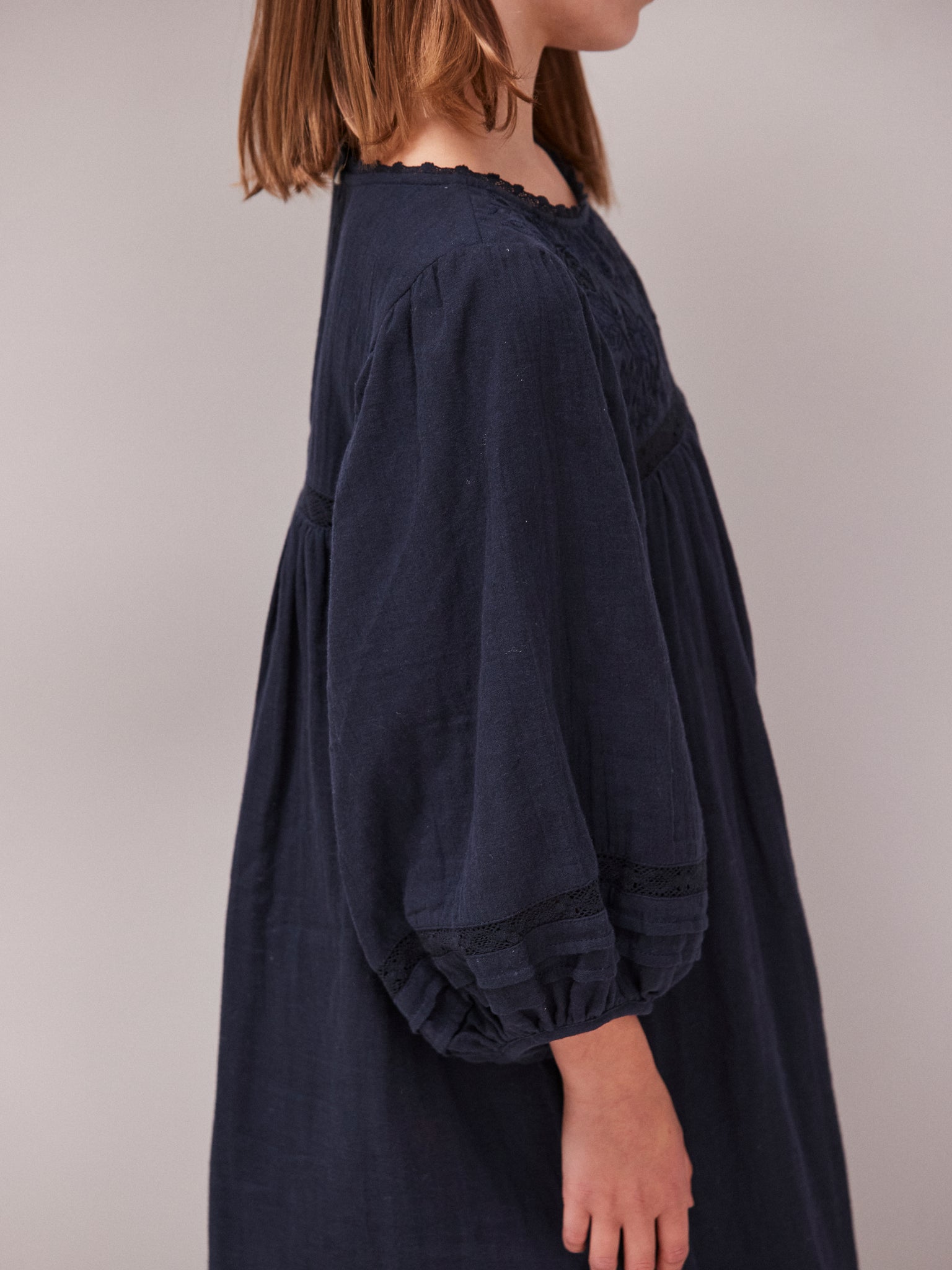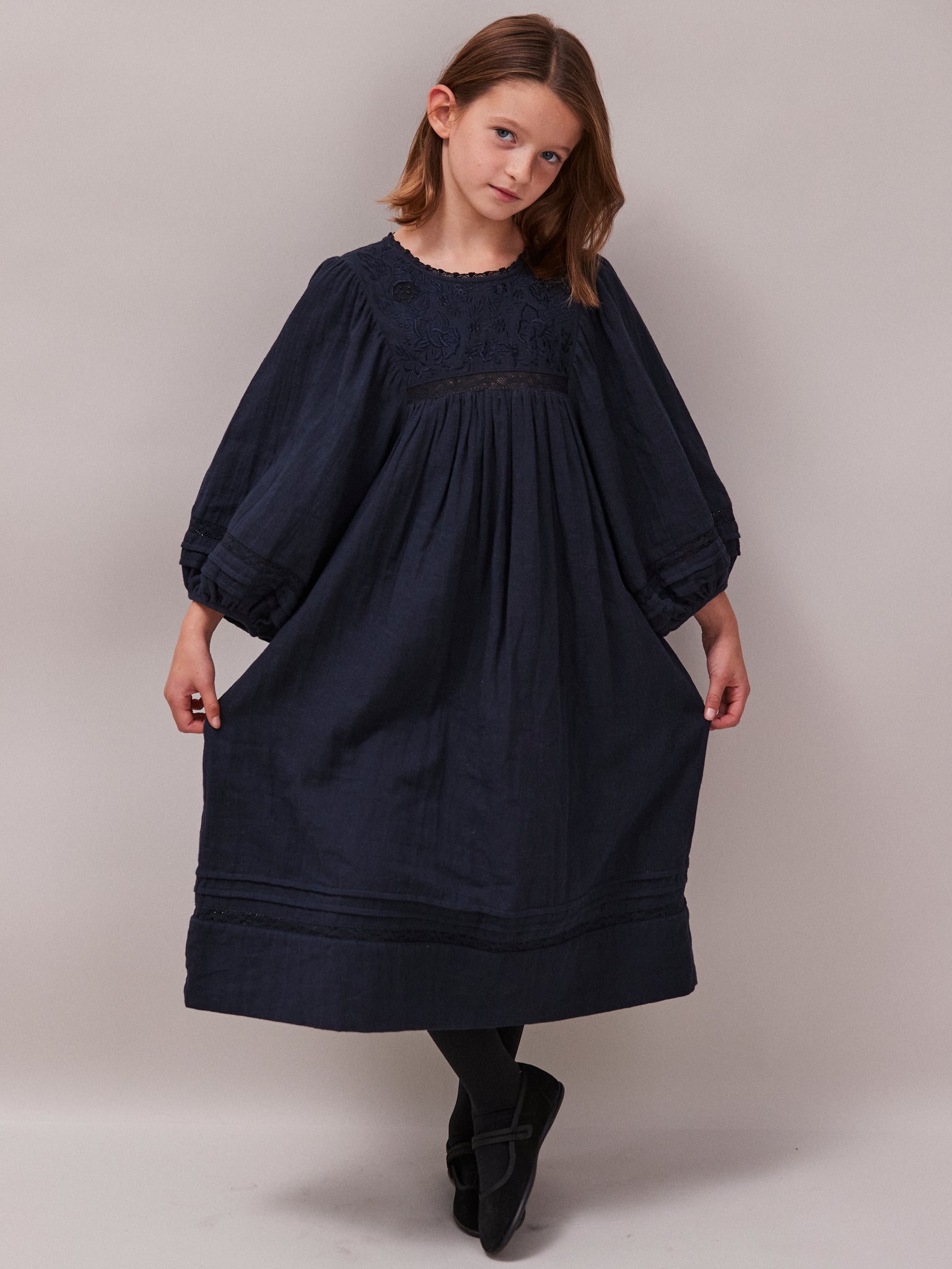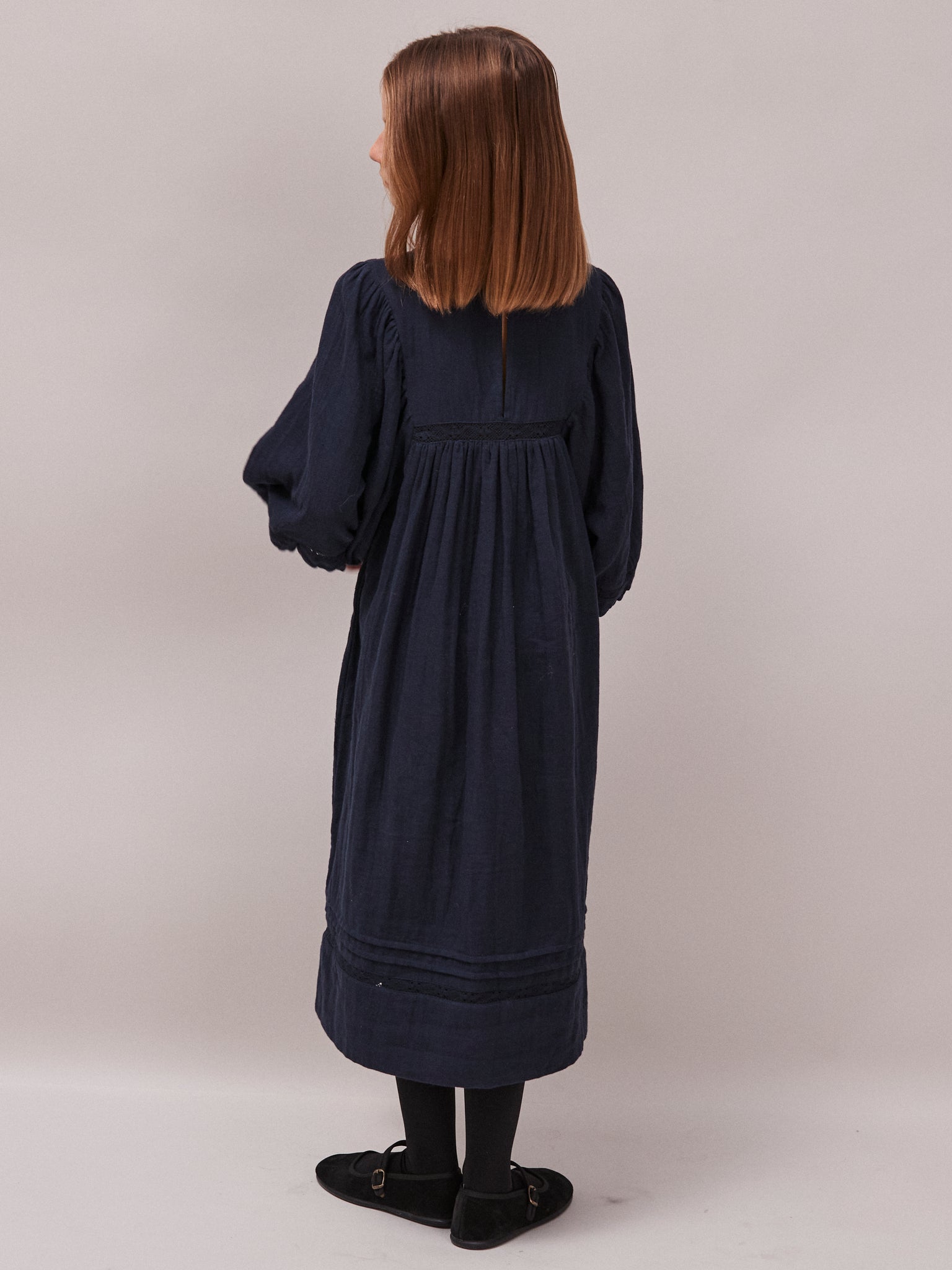 Lotus is a beautiful dress designed with the festive season in mind. Cut in a warmer double cotton gauze base in our new INK blue shade.