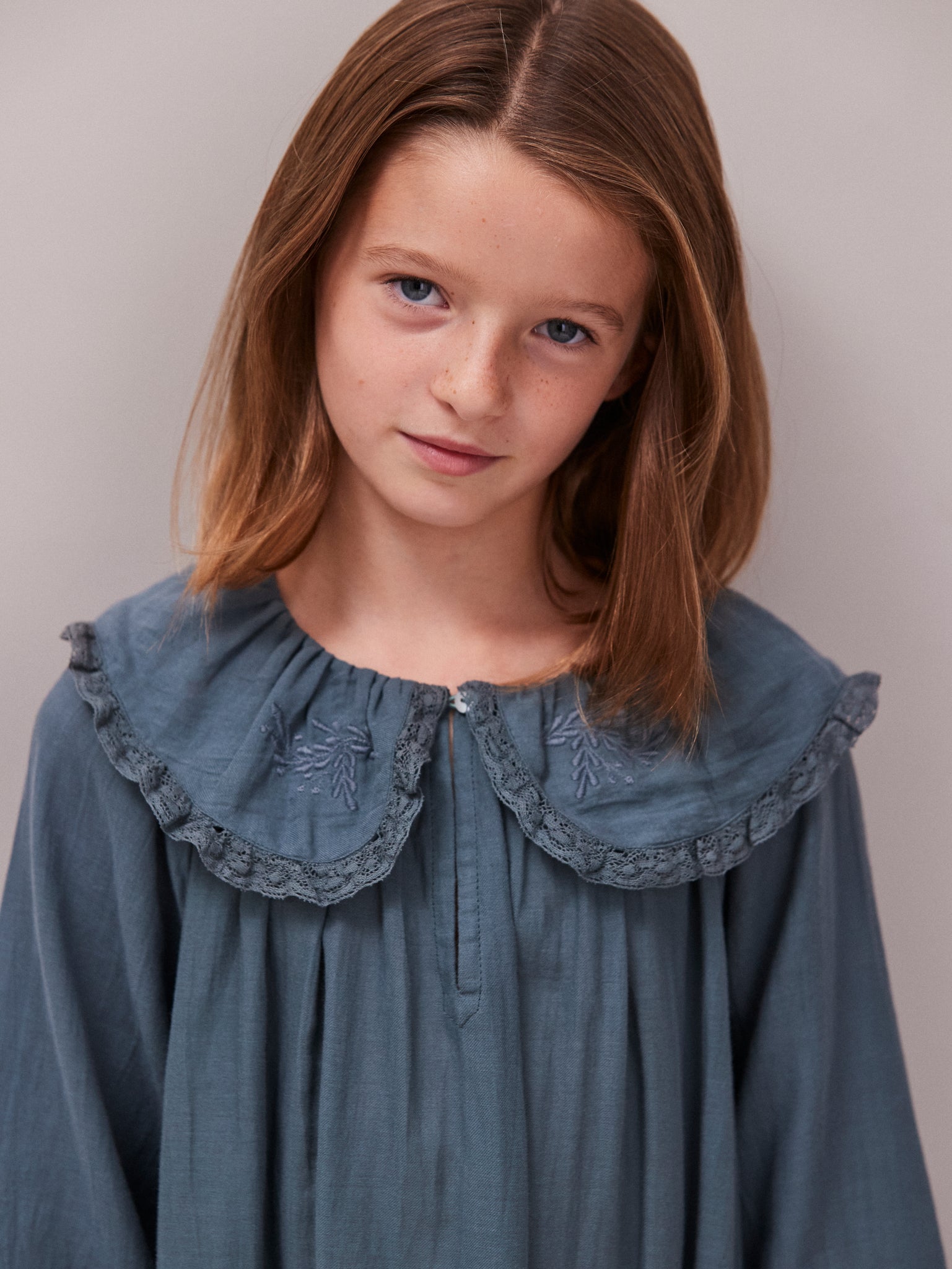 Hebe is a beautiful nightie designed with the festive season in mind. Cut in a warmer cotton twill base in our new season Kingfisher blue shade with cute peter pan collars.
