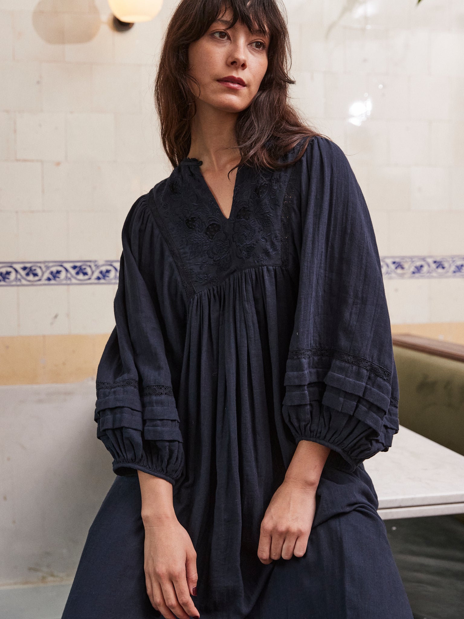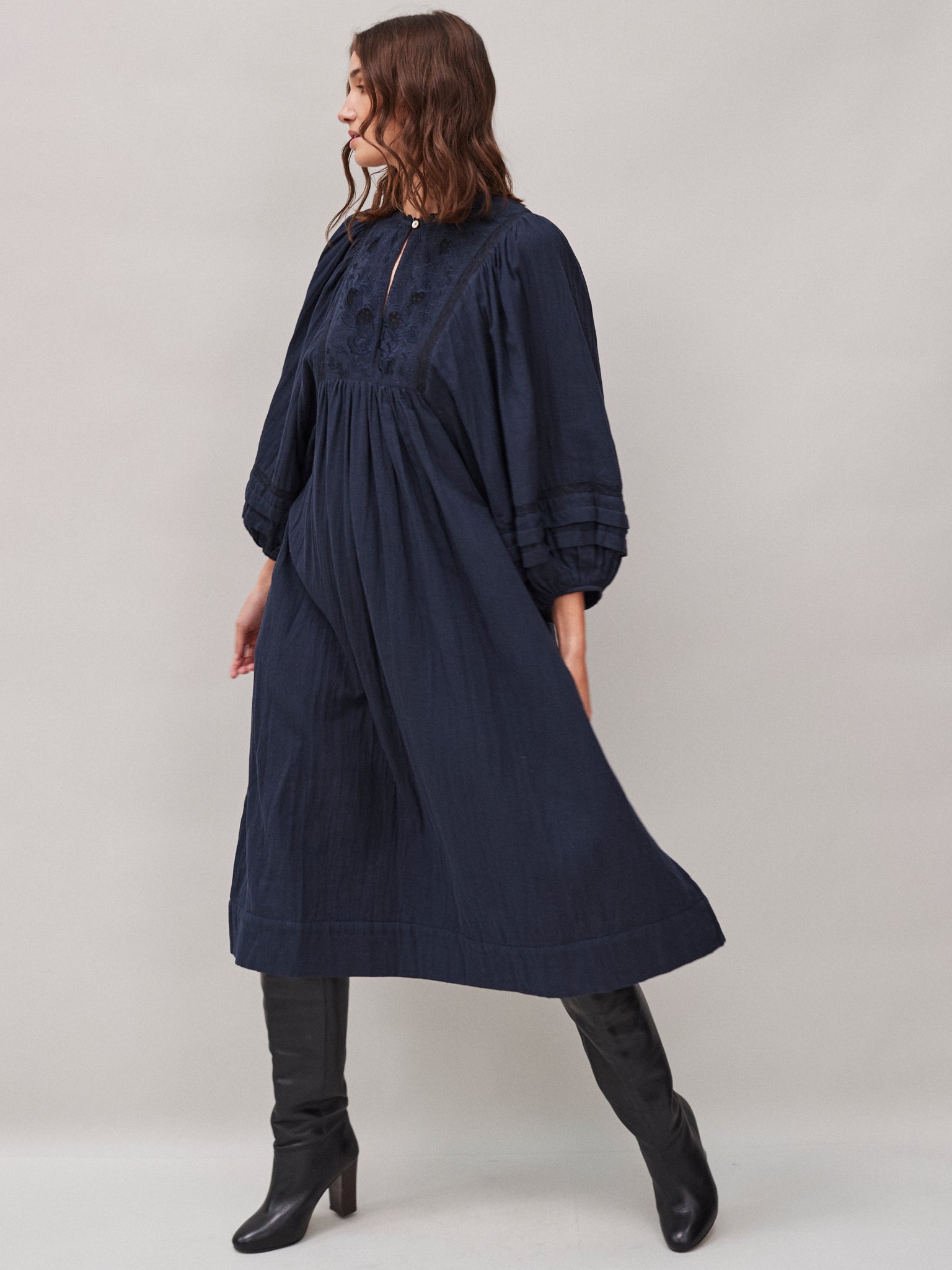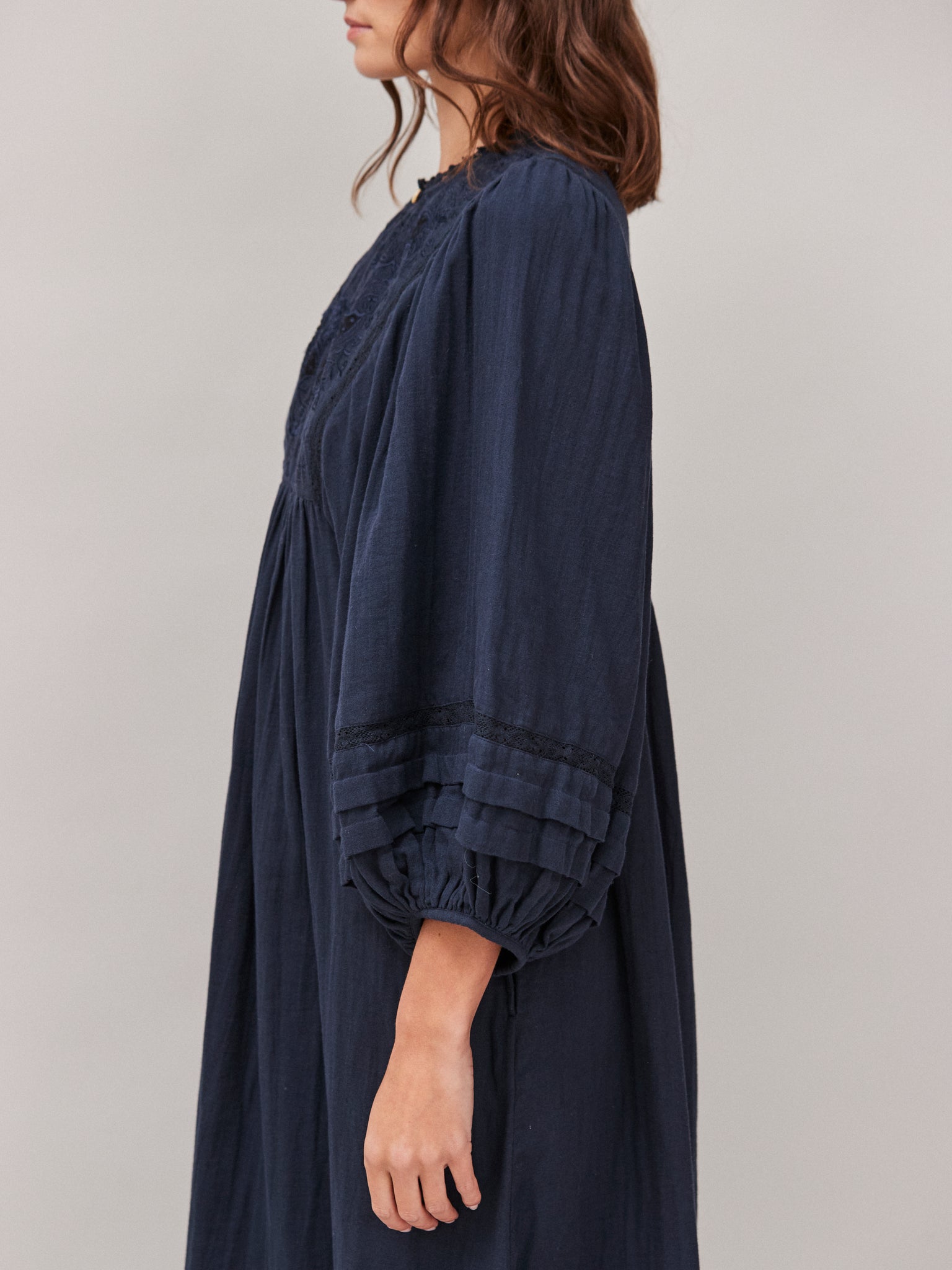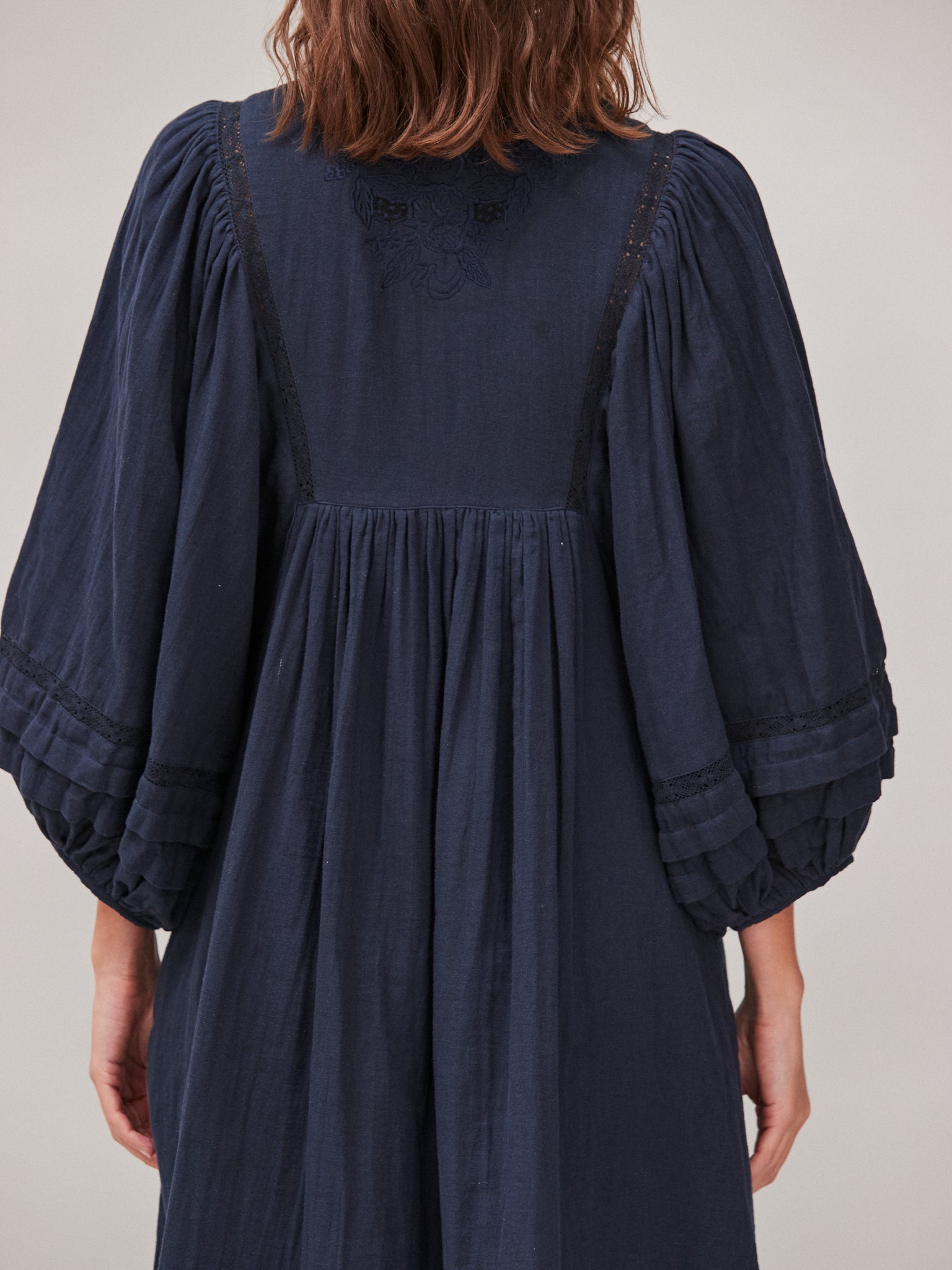 Josephine Midi Dress in INK blue | Double Cotton gauze - This airy smock dress features elegant balloon sleeves and intricate lace trims and embroidery.
