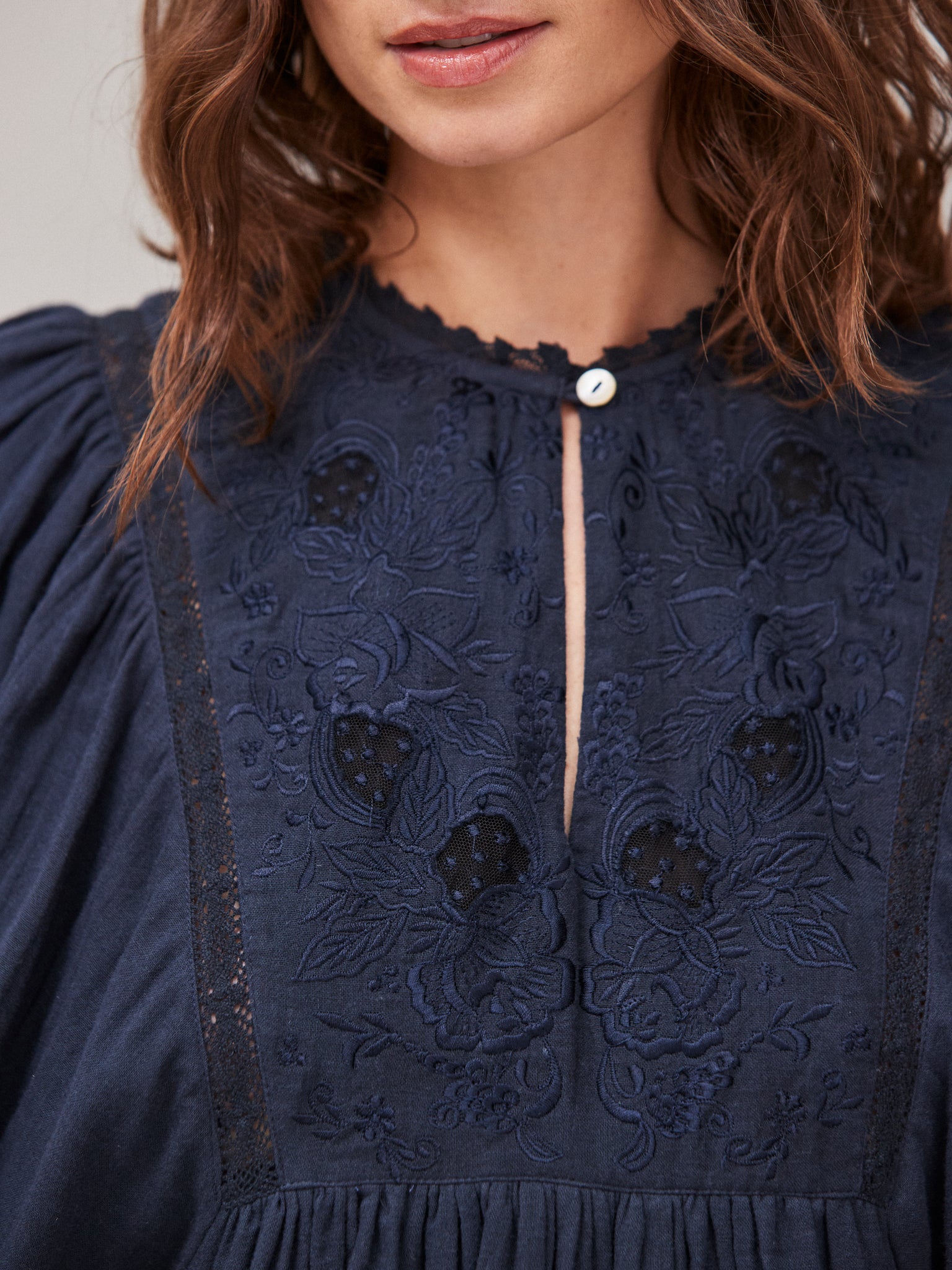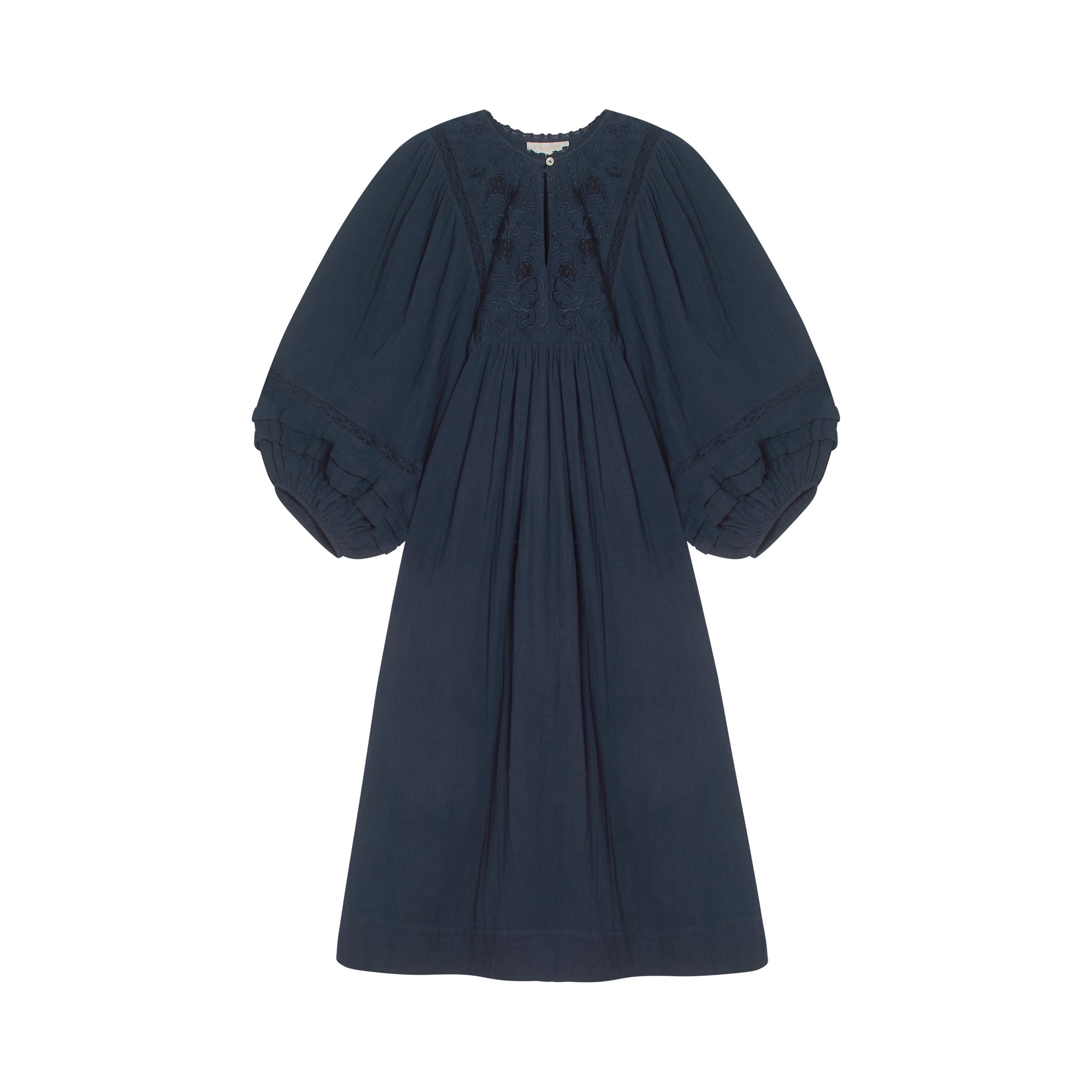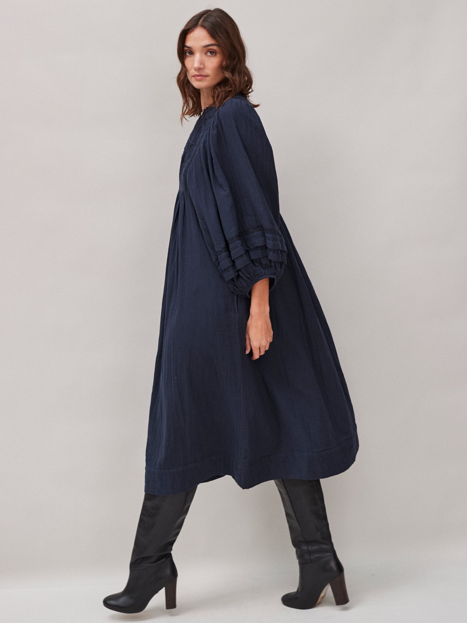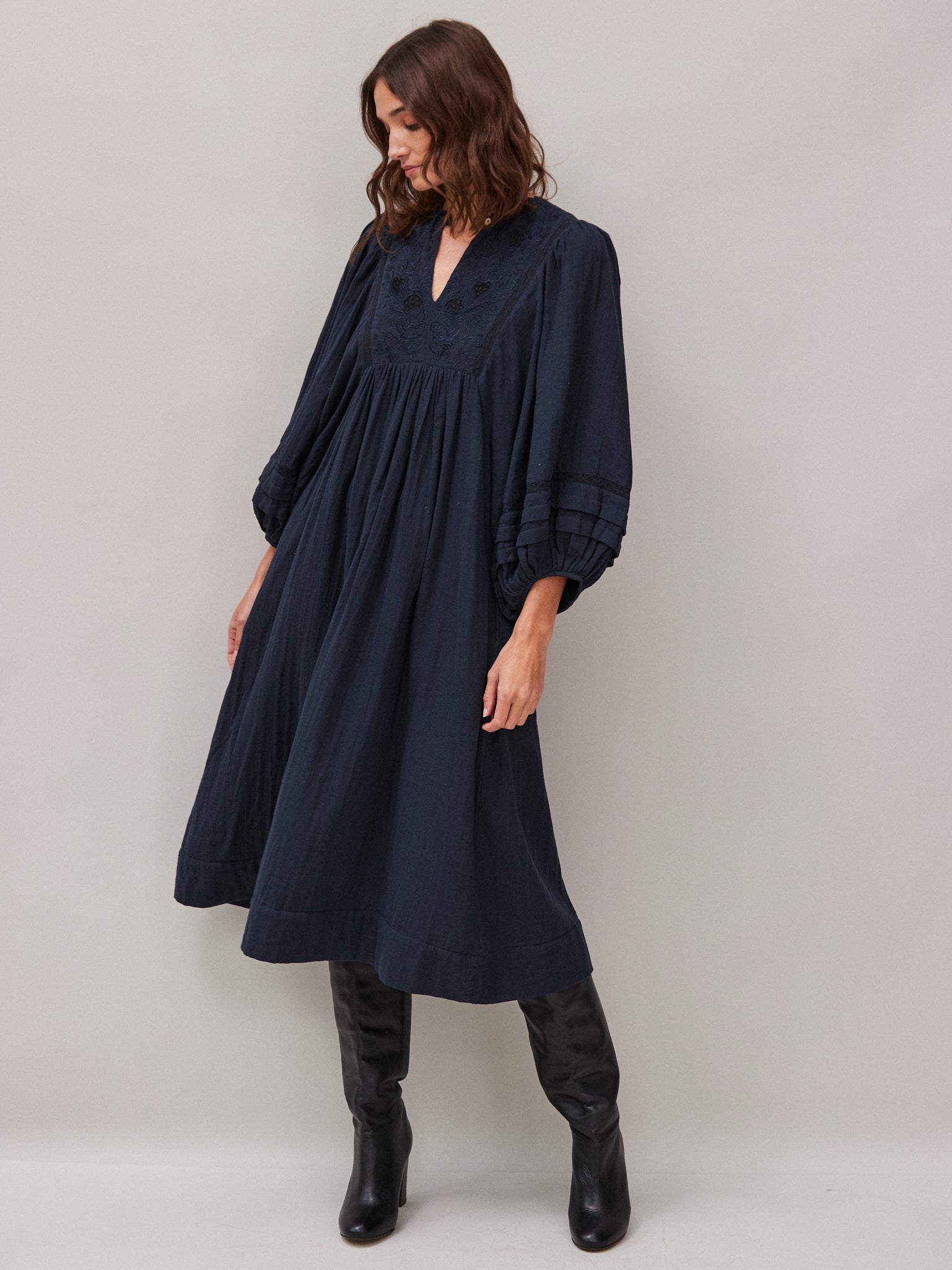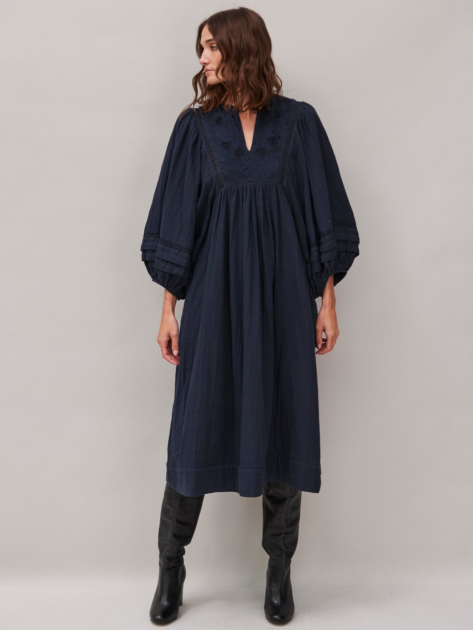 Josephine Midi Dress in INK blue | Double Cotton gauze - This airy smock dress features elegant balloon sleeves and intricate lace trims and embroidery.