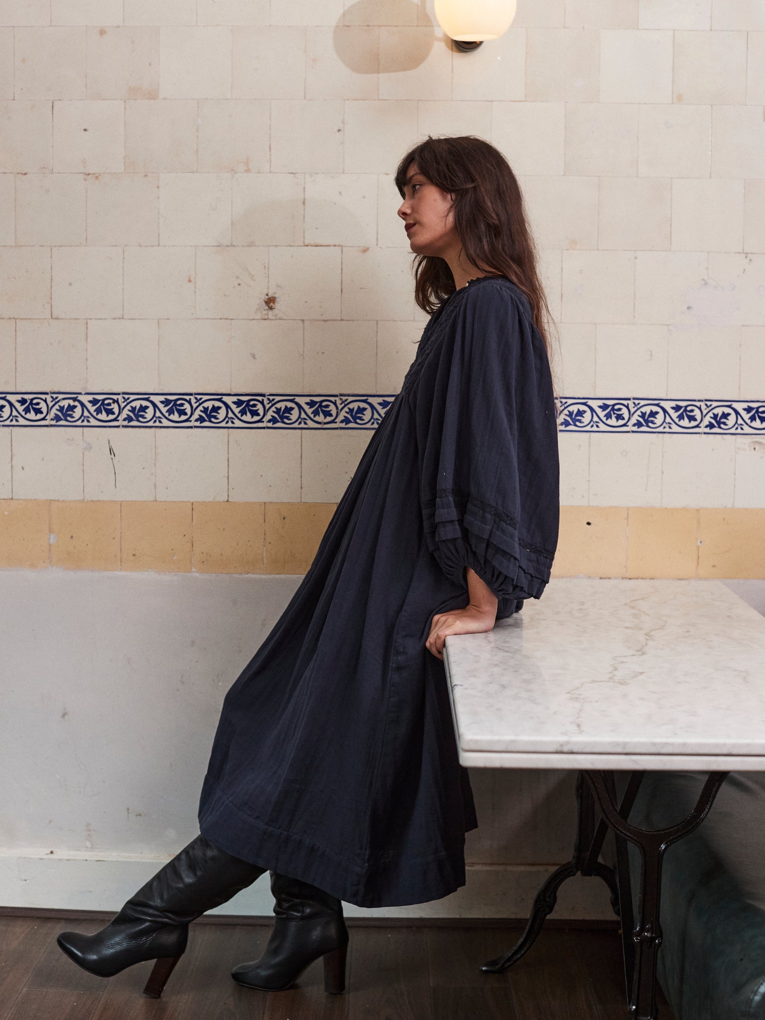 The much loved Josephine dress is back but this time in a beautufully rich dark INK blue. Crafted from a super soft double gauze cotton, this dress boasts oversized balloon sleeves and delicate details such as lace trims, embroidery, and shell button at front neck opening. Multiple gathers add incredible volume to the silhouette, creating a comfortable and stylish option for lounging and relaxation, paired with boots this versatile dress will be your go to for a relaxed eveing out. Faune's signature lace trims and pleats add a delicate touch to this beautiful and timeless style. Available in Ink blue
