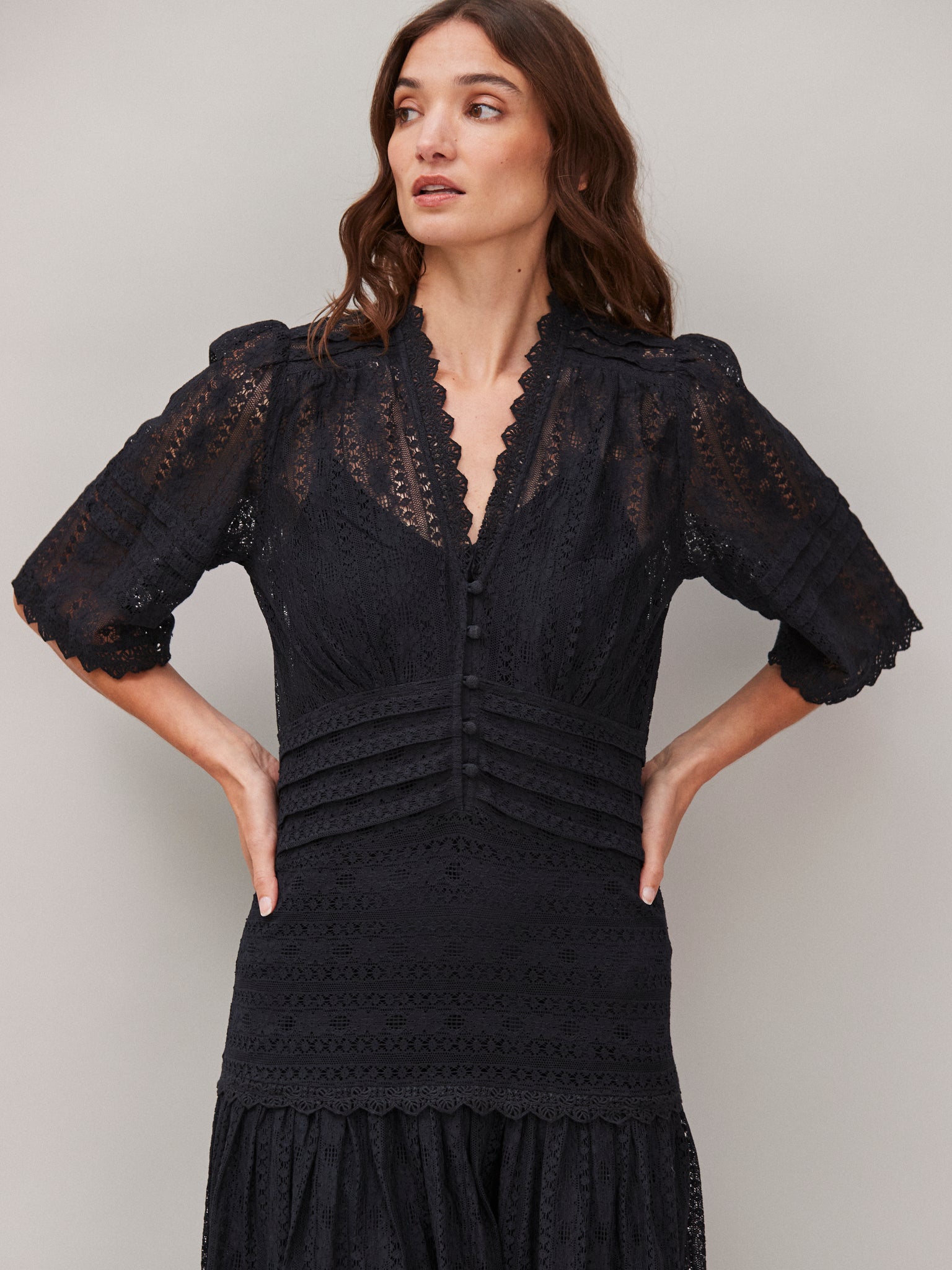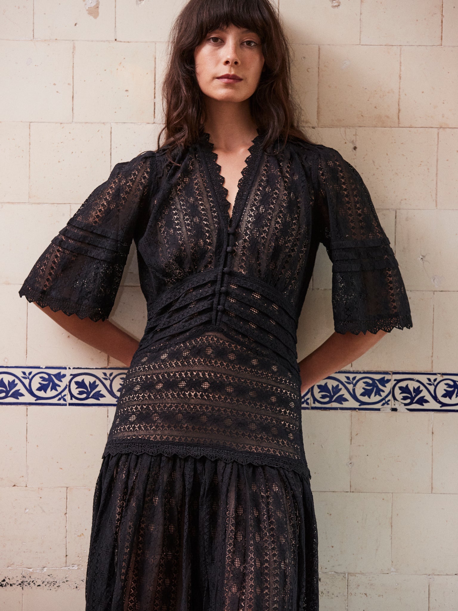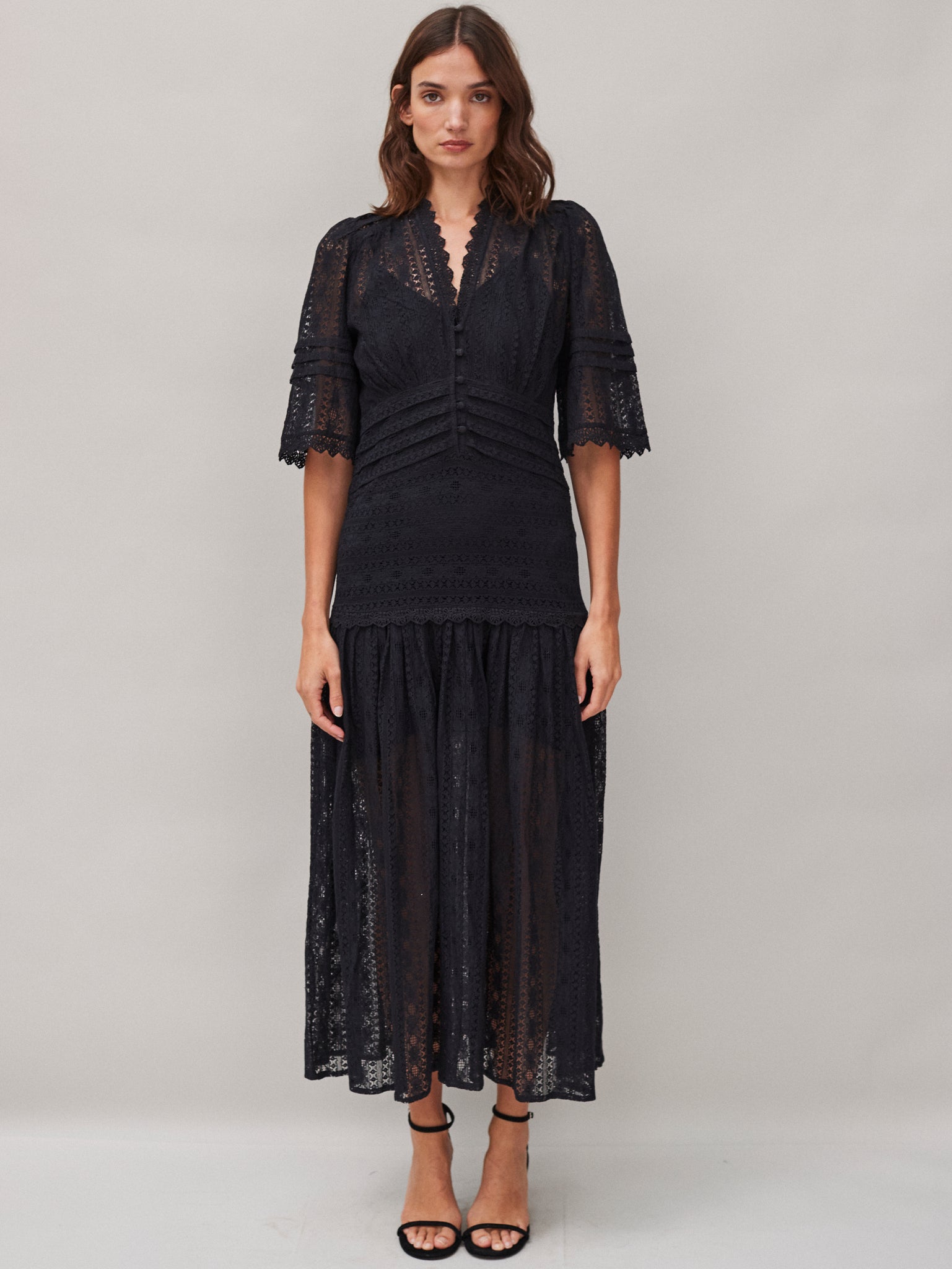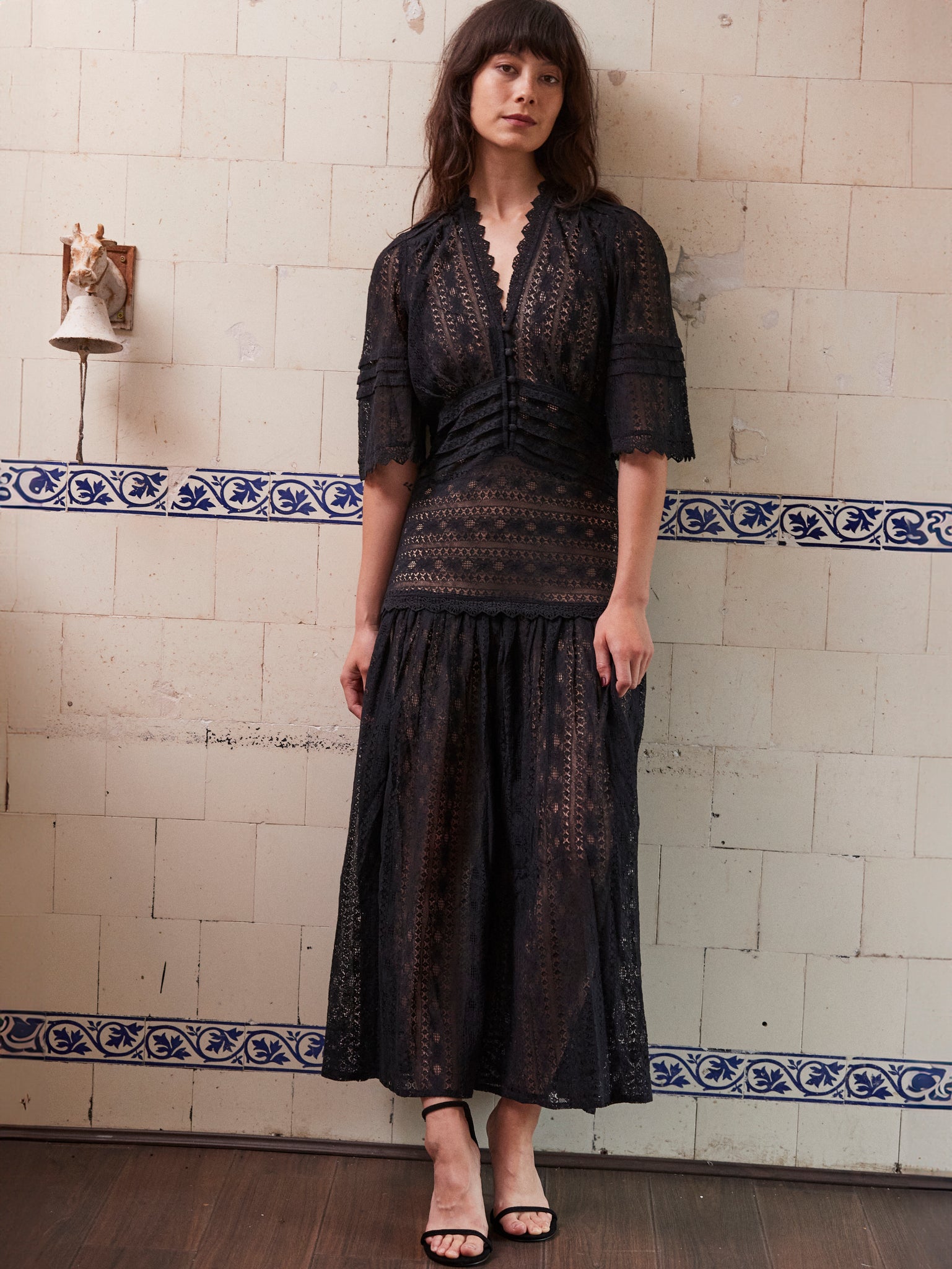 Starlette is a beautiful maxi dress made in a lovely black cotton lace. The drop-waist creates a flattering silhouette with soft gathers adding drama to this already stand out piece. The deep'V' neck, delicate lace fabric and cute covered bead buttons add vintage charm whilst the cotton lace trims give the dress a beautiful finish. The Starlette has a separate lining.