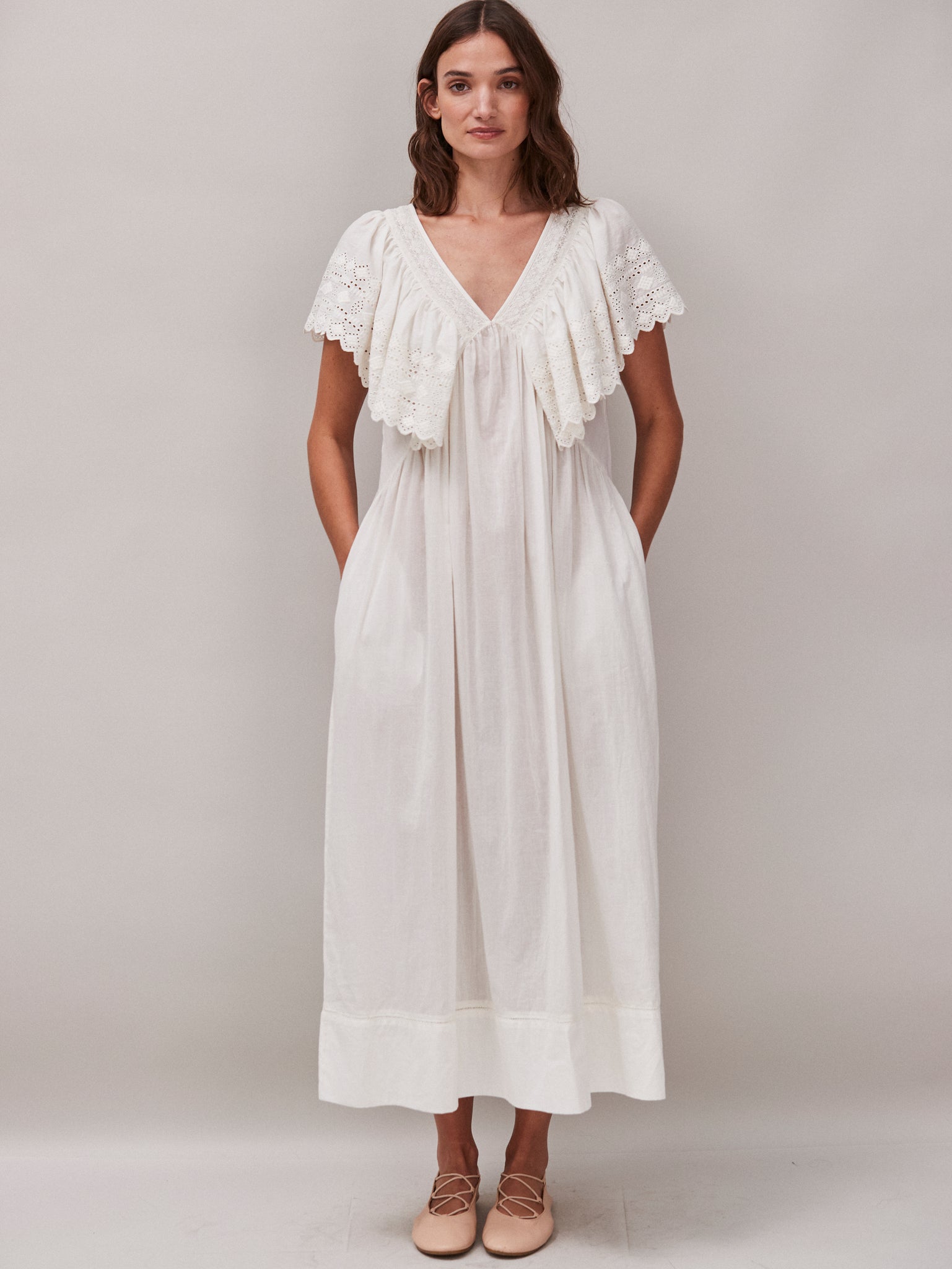 Camellia, romantic long dress with schiffli frill sleeves in white | cotton voile