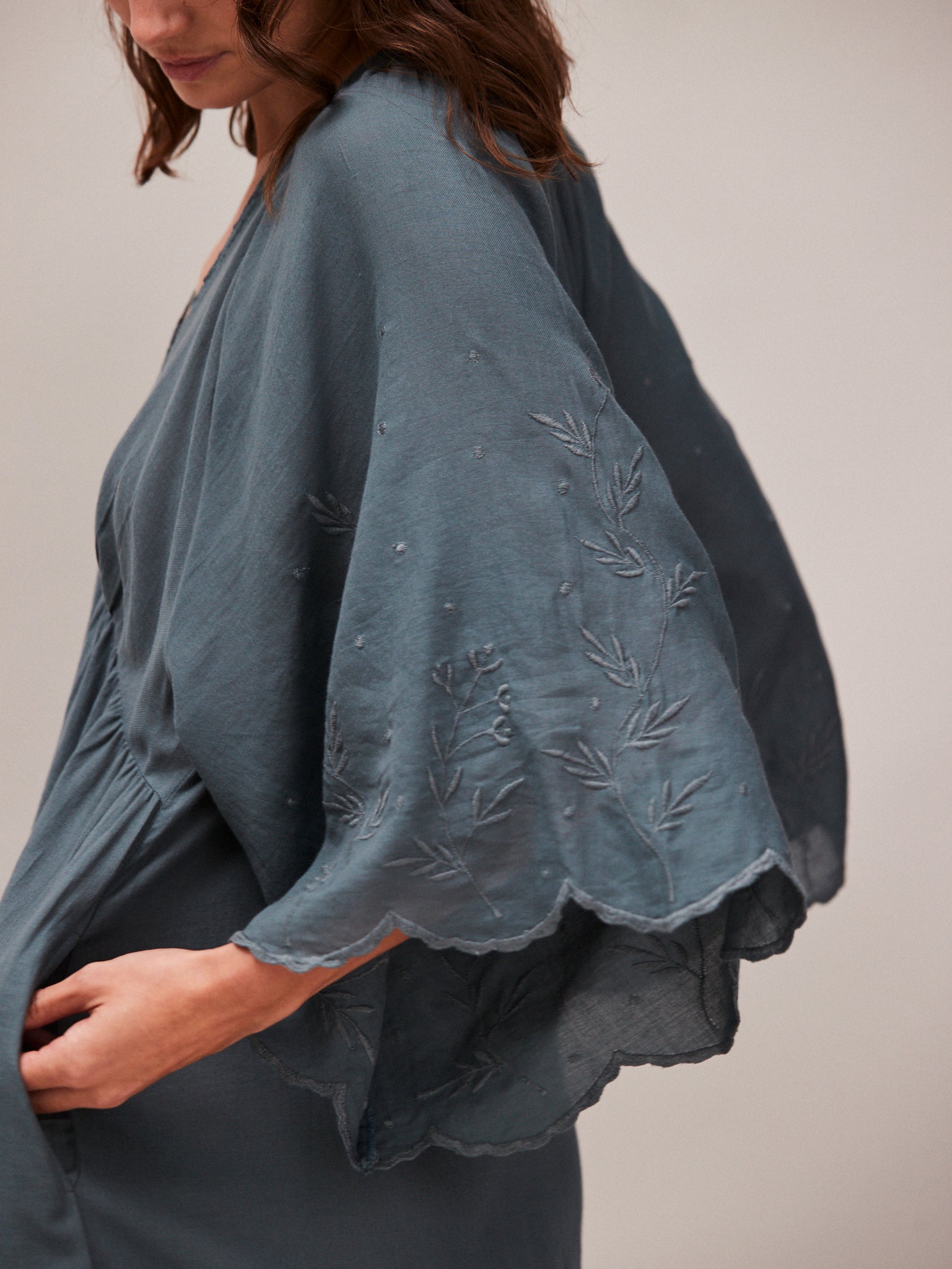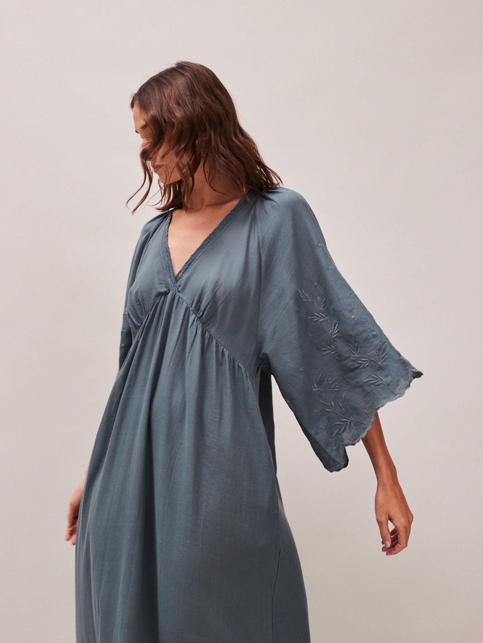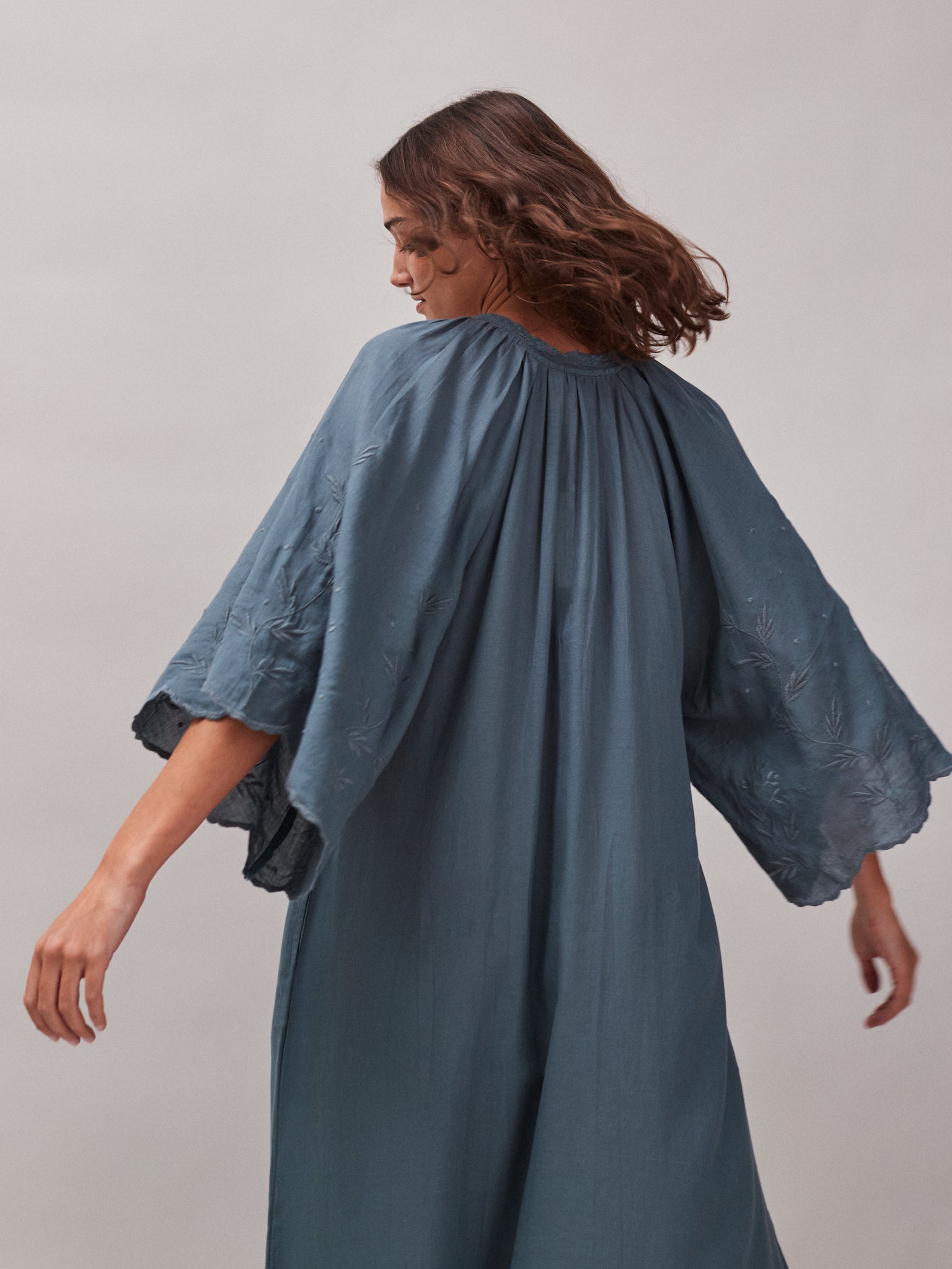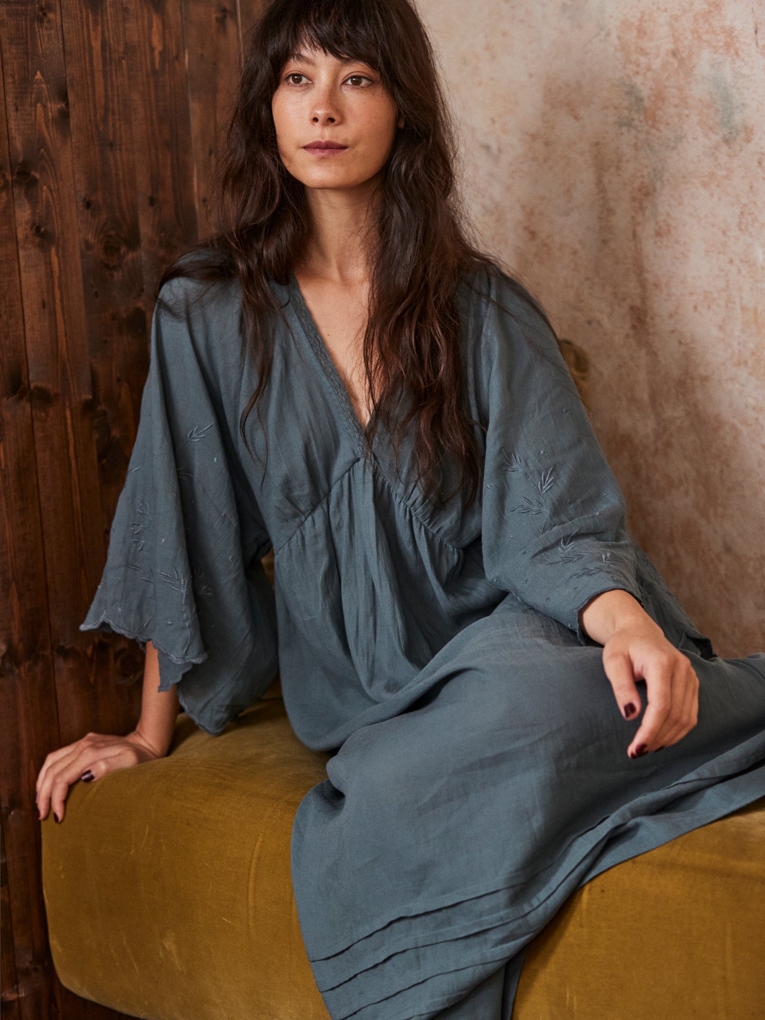 This winter version of our much loved Tiger Lily has all the same stunning details and more. With delicate lace trim around the deep 'V' neck and the same exaggerated scalloping and embroidery - but this time the sleeves are longer for added winter warmth. The shape is a little different too - with an under bust seam at the front creating a slimmer silhouette. There are gathers adding drape to this already gorgeous nightdress. Made in our warmer cotton twill fabric in our new rich kingfisher blue shade which is perfect for lounging in on cosy evenings. This beautiful nightgown is so versatile and can easily be worn as a dress. We think this will make a wonderful Christmas nightie.