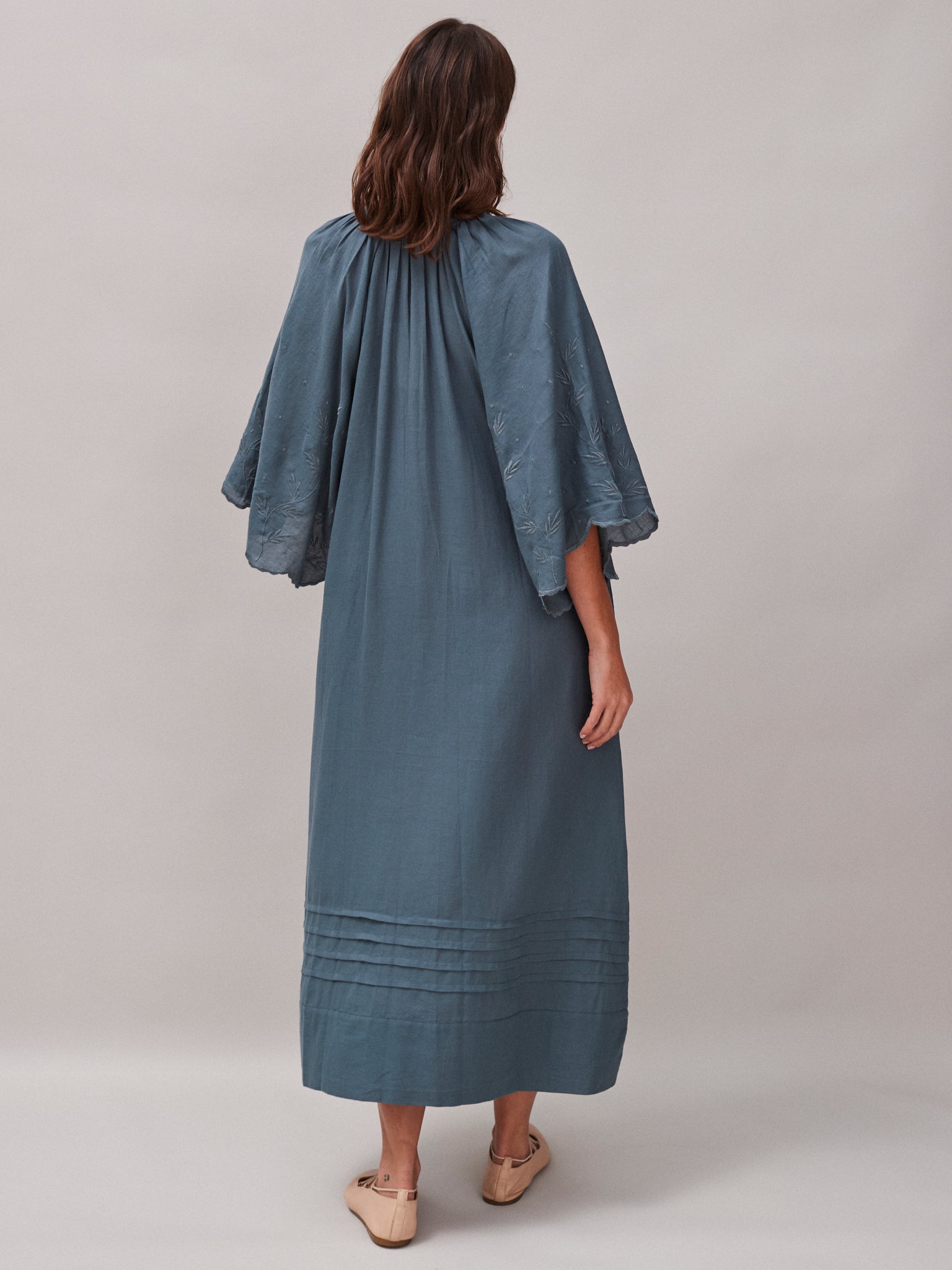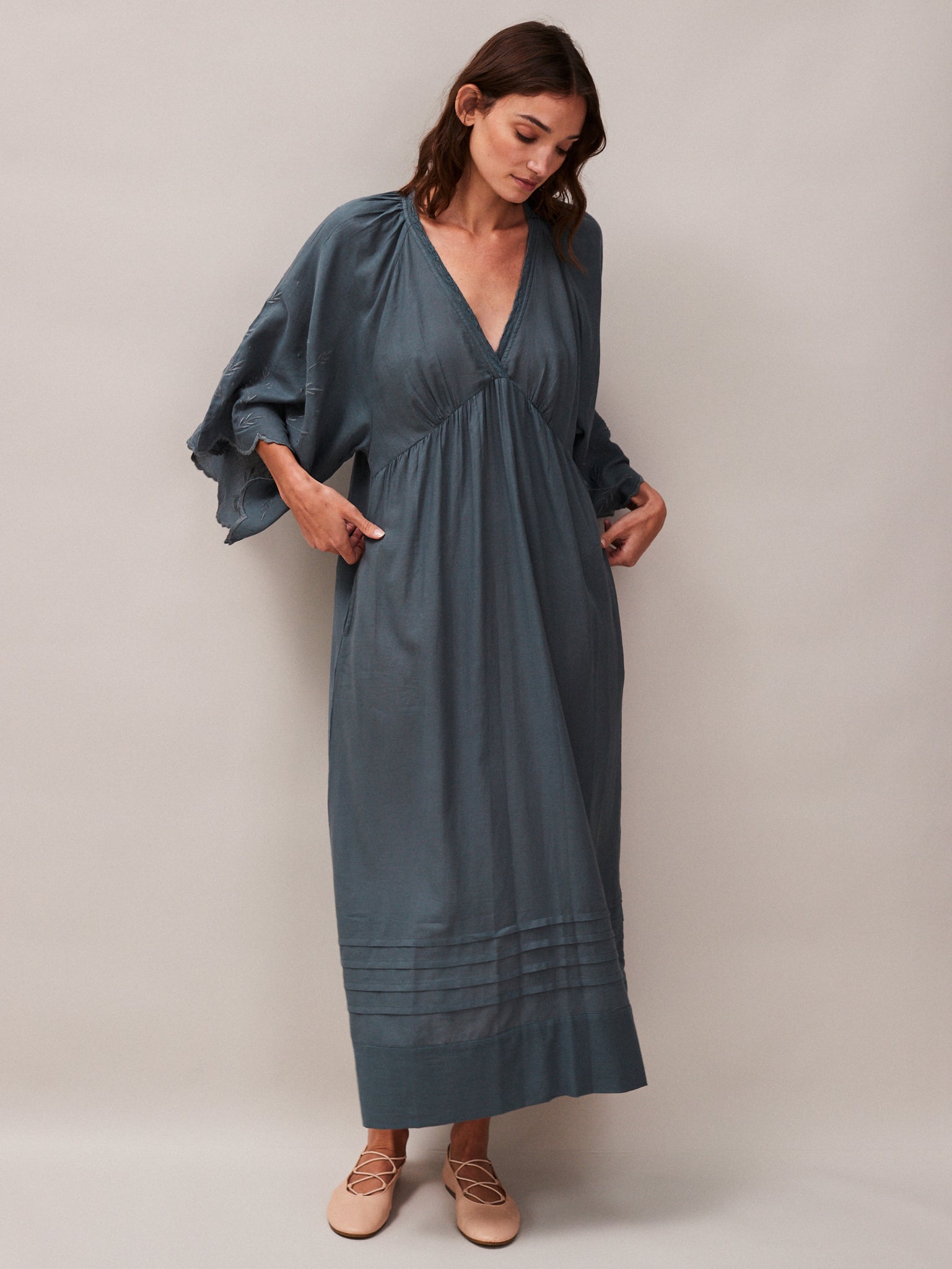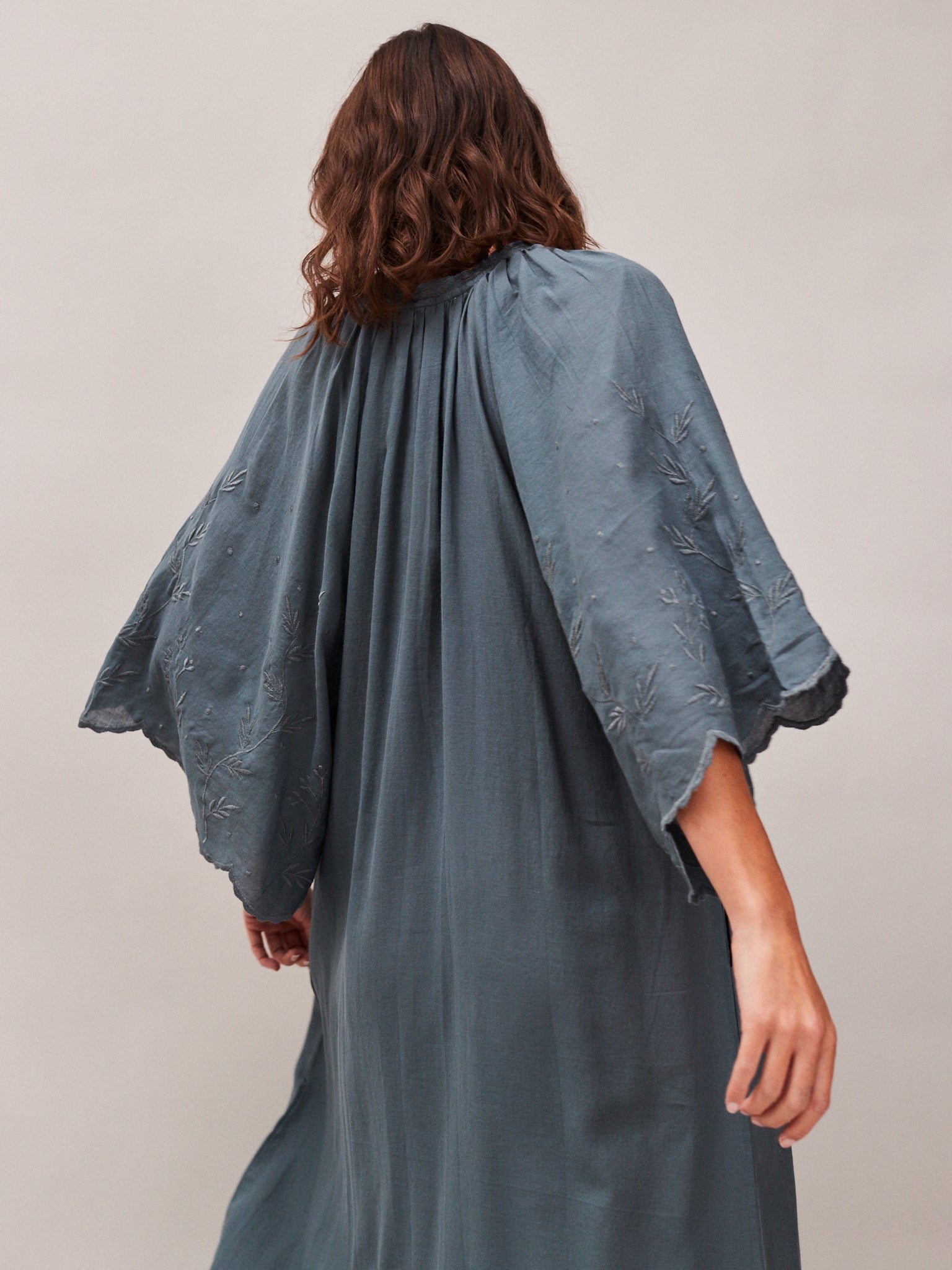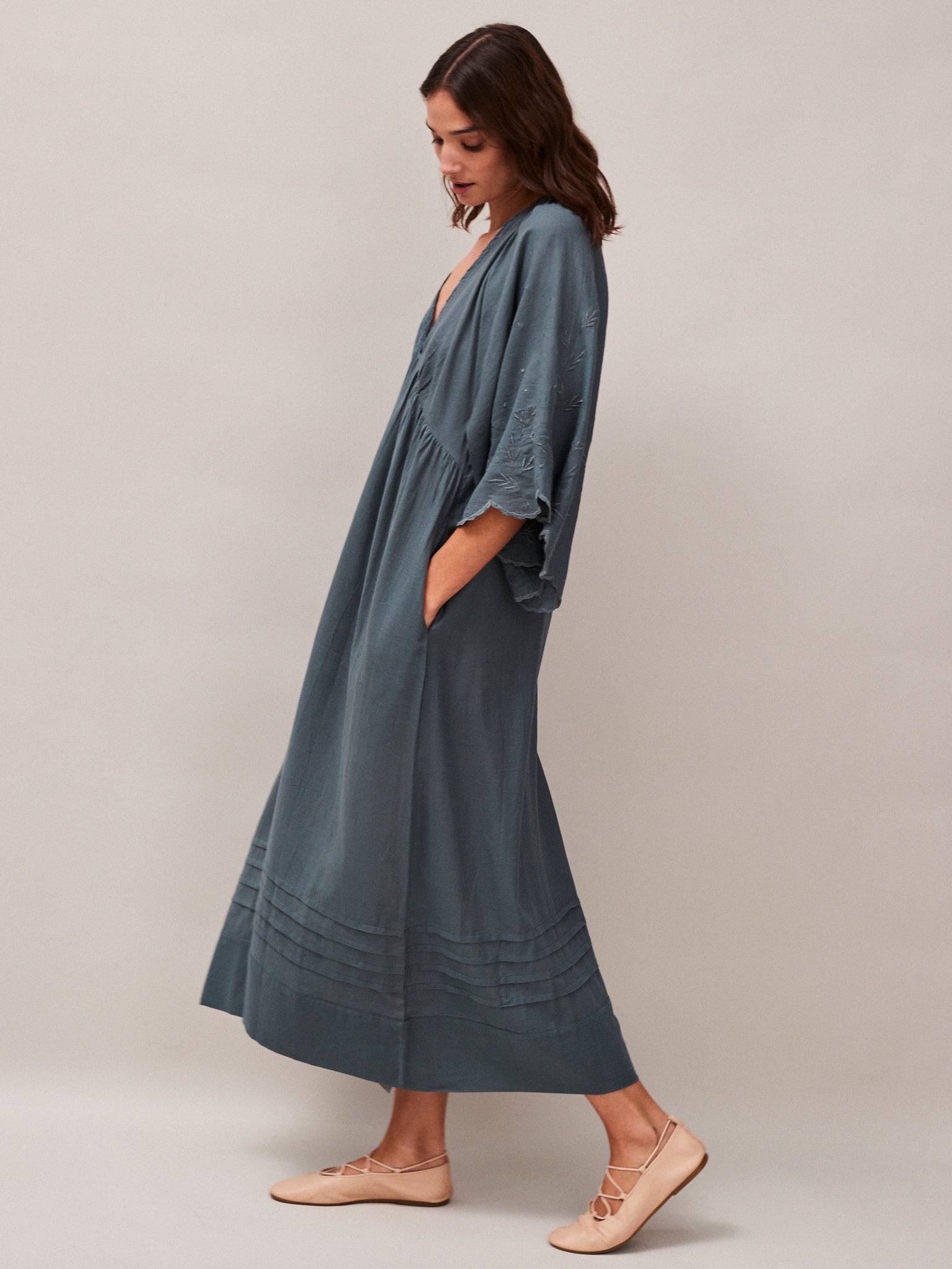 This winter version of our much loved Tiger Lily has all the same stunning details and more. With delicate lace trim around the deep 'V' neck and the same exaggerated scalloping and embroidery - but this time the sleeves are longer for added winter warmth. The shape is a little different too - with an under bust seam at the front creating a slimmer silhouette. There are gathers adding drape to this already gorgeous nightdress. Made in our warmer cotton twill fabric in our new rich kingfisher blue shade which is perfect for lounging in on cosy evenings. This beautiful nightgown is so versatile and can easily be worn as a dress. We think this will make a wonderful Christmas nightie.