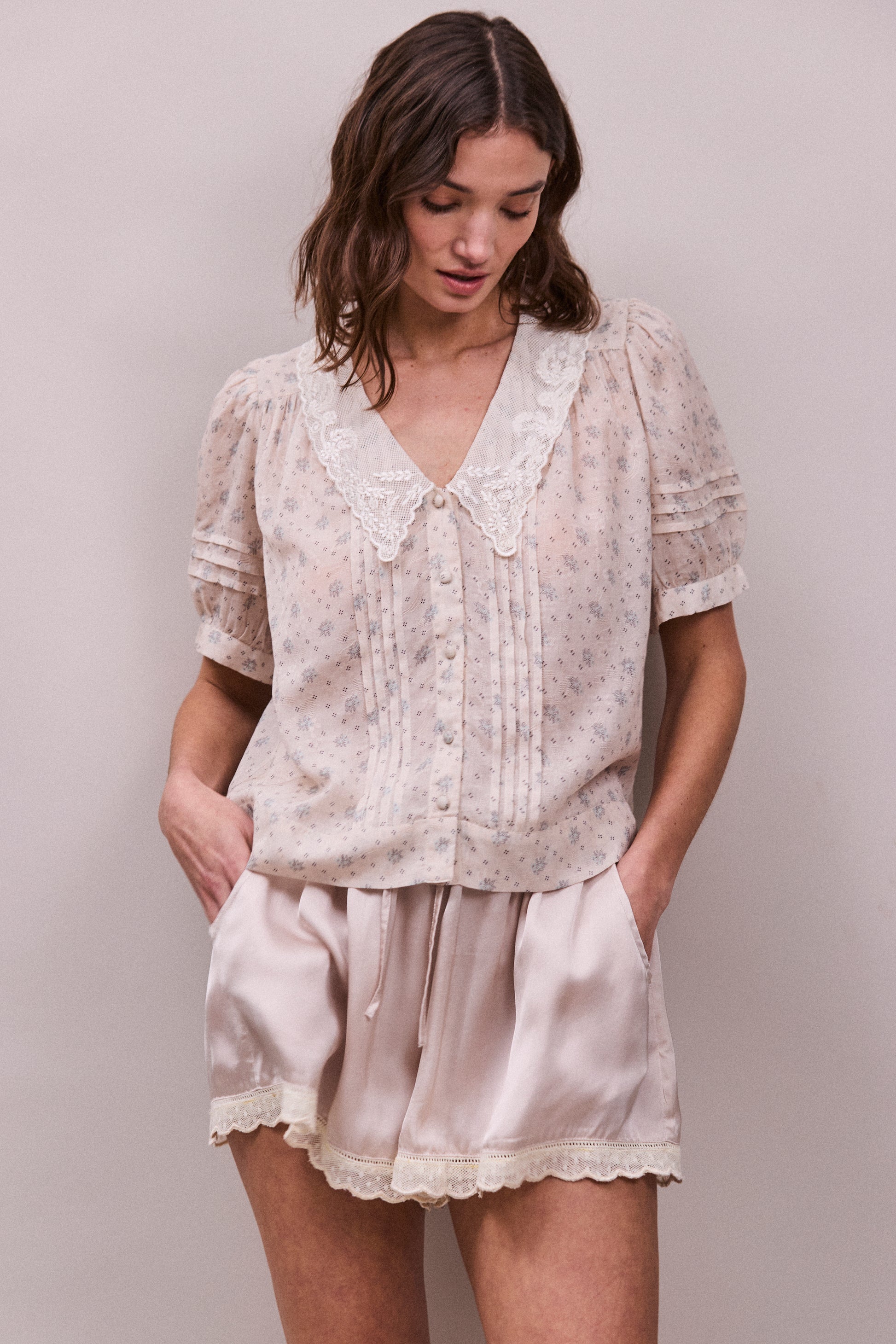 Fine pintucks run down the front panel, leading to a row of covered buttons, while the softly gathered short sleeves are finished with stitched band detailing for a delicate vintage feel.