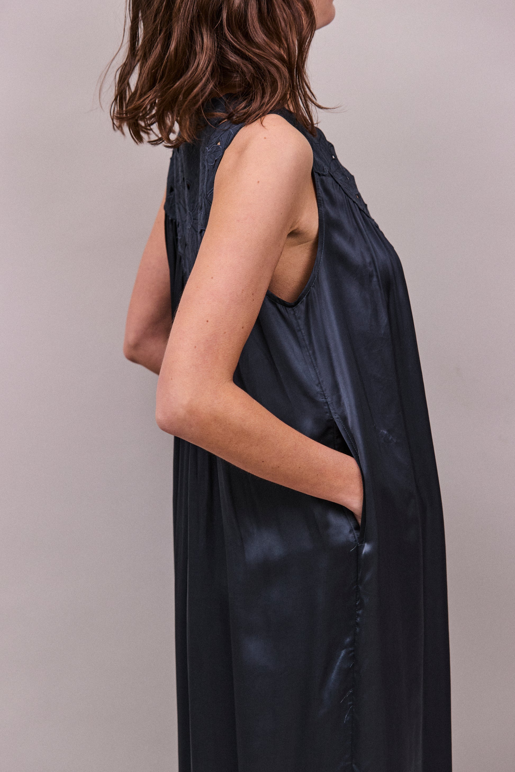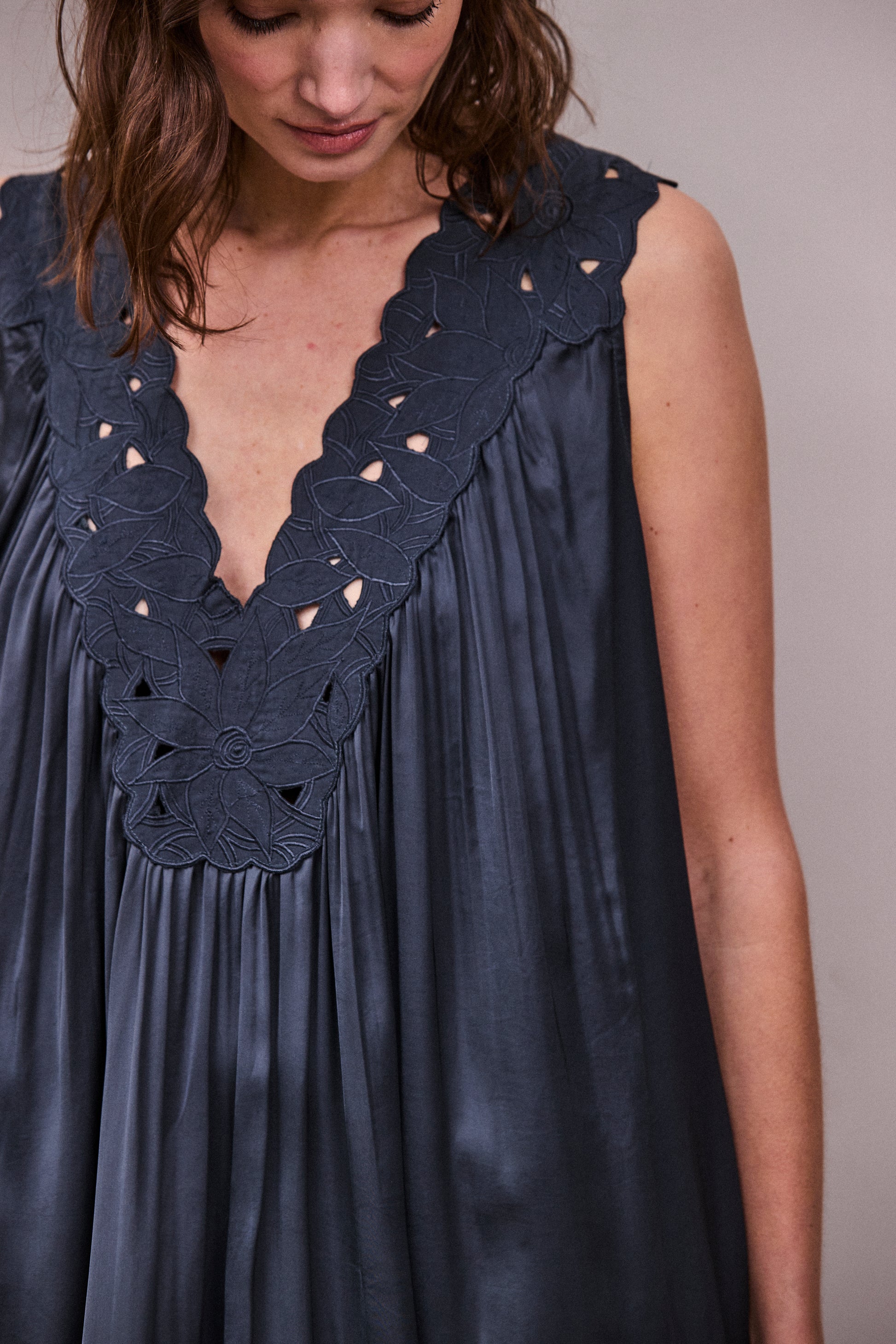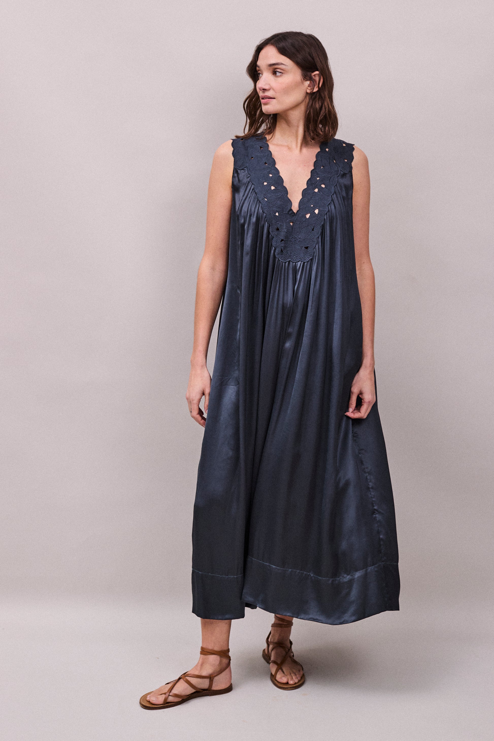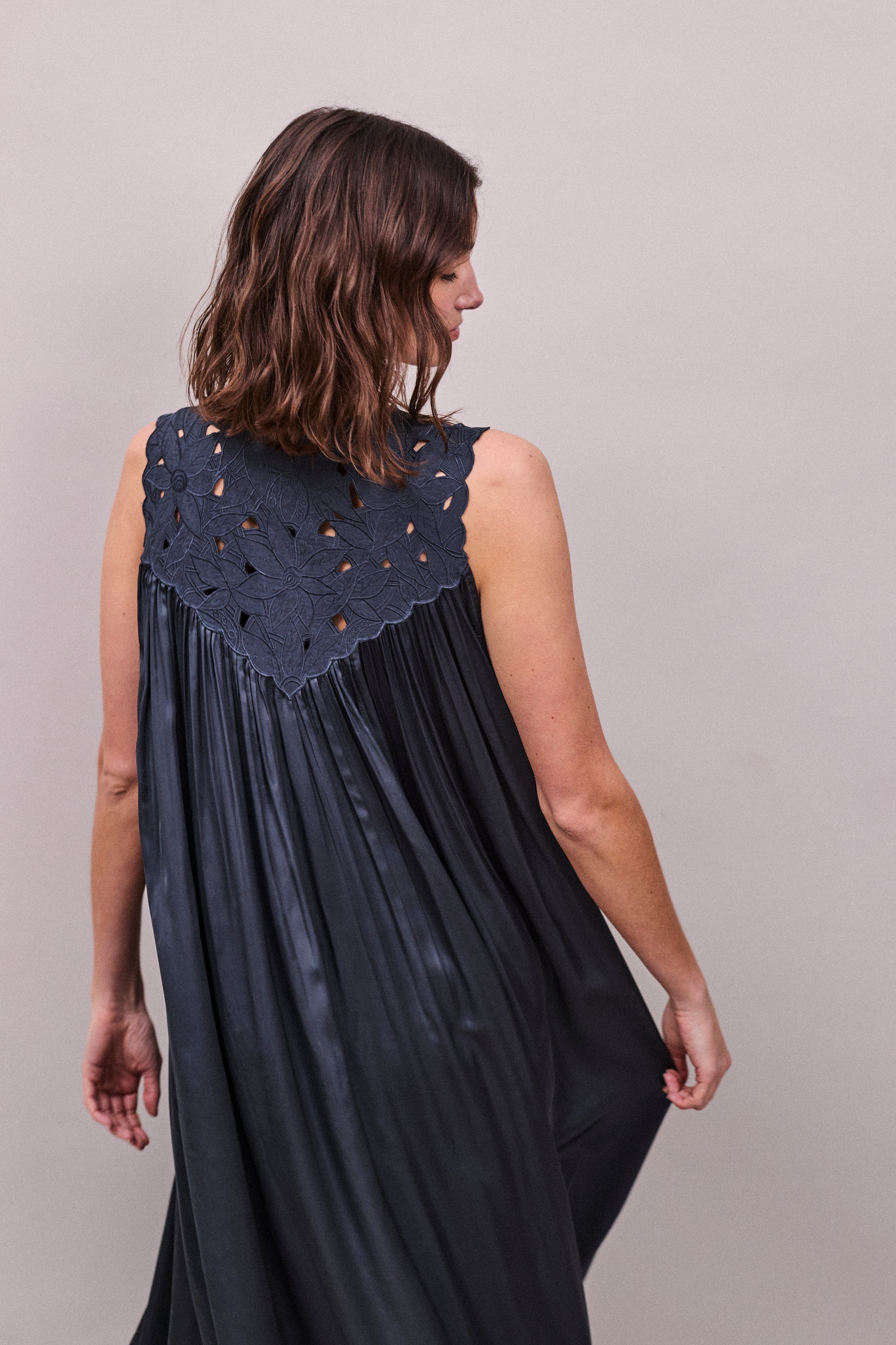 At the neckline, hand-cut cotton embroidery frames the front and back in a soft, sculptural pattern, adding depth and quiet detail to the simplicity of the shape. The deep V opening elongates the line of the body, while soft gathers through the front allow the fabric to fall in fluid, vertical lines.