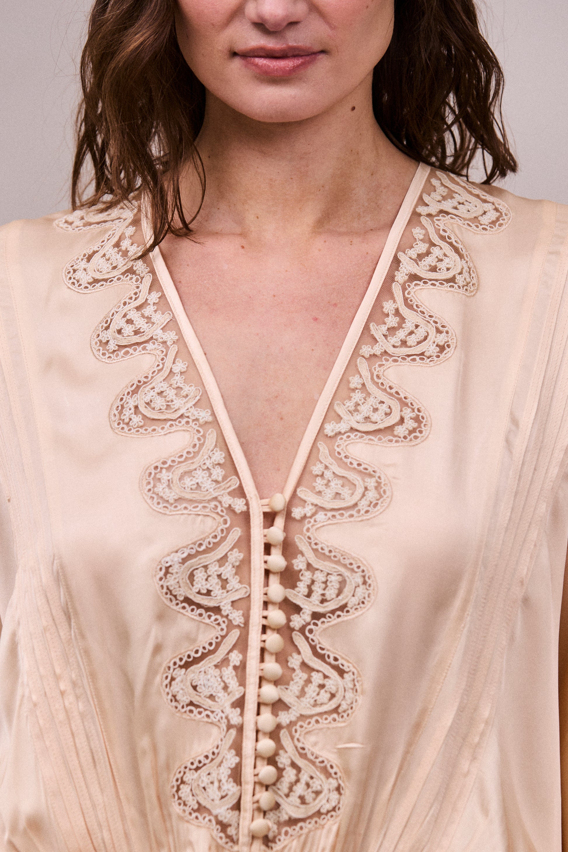 - Vintage inspired insert lace details, embroidery and pin-tucks