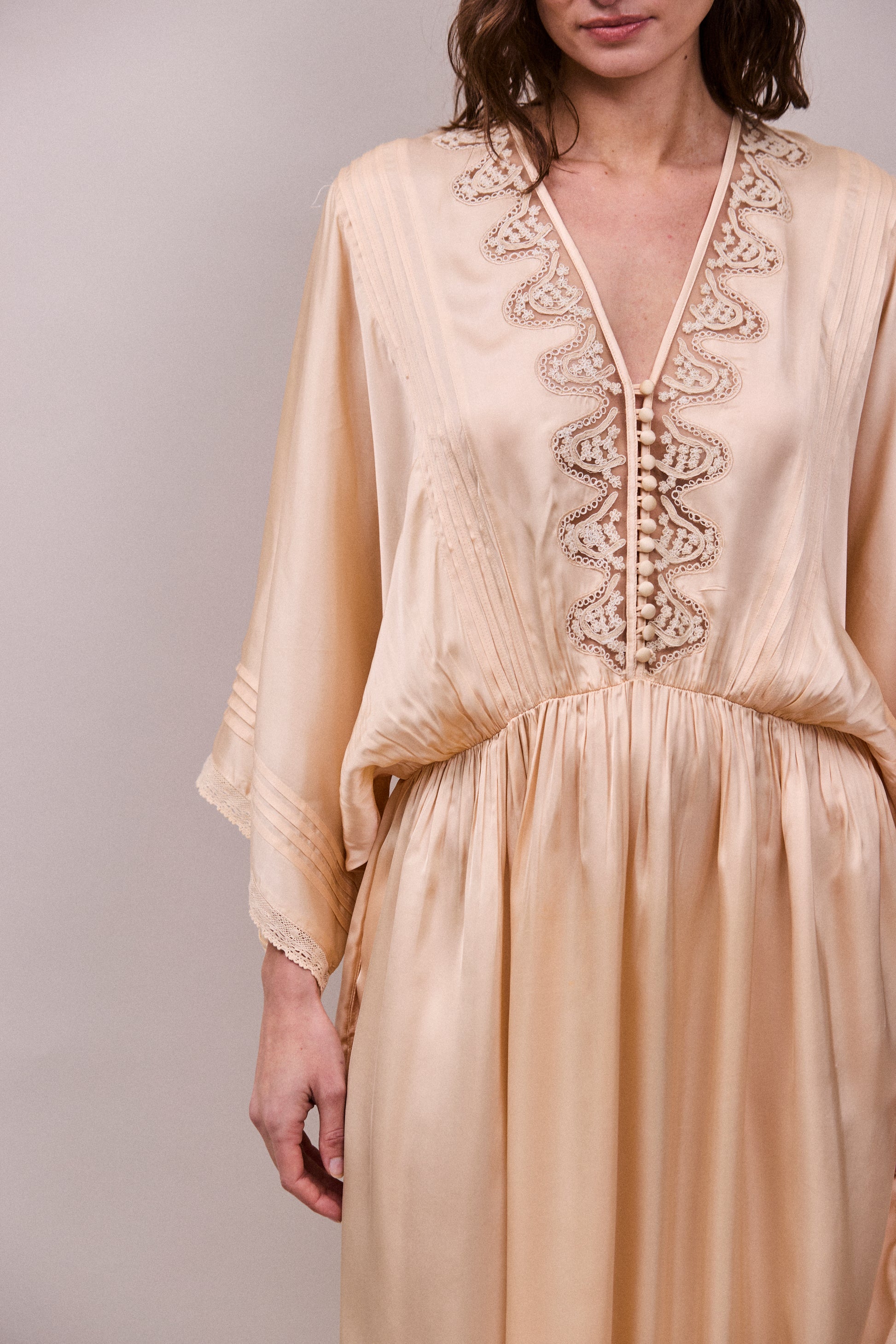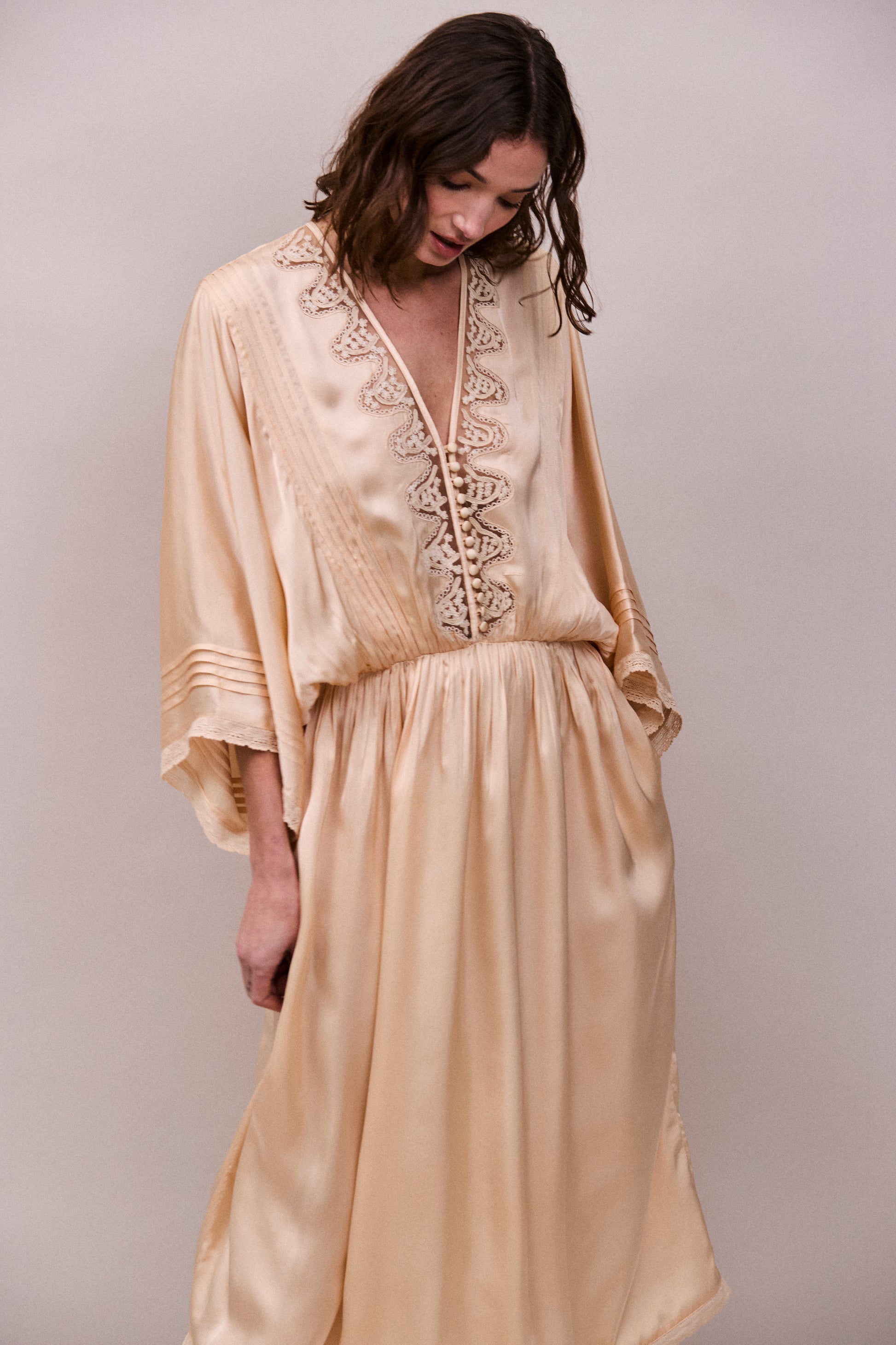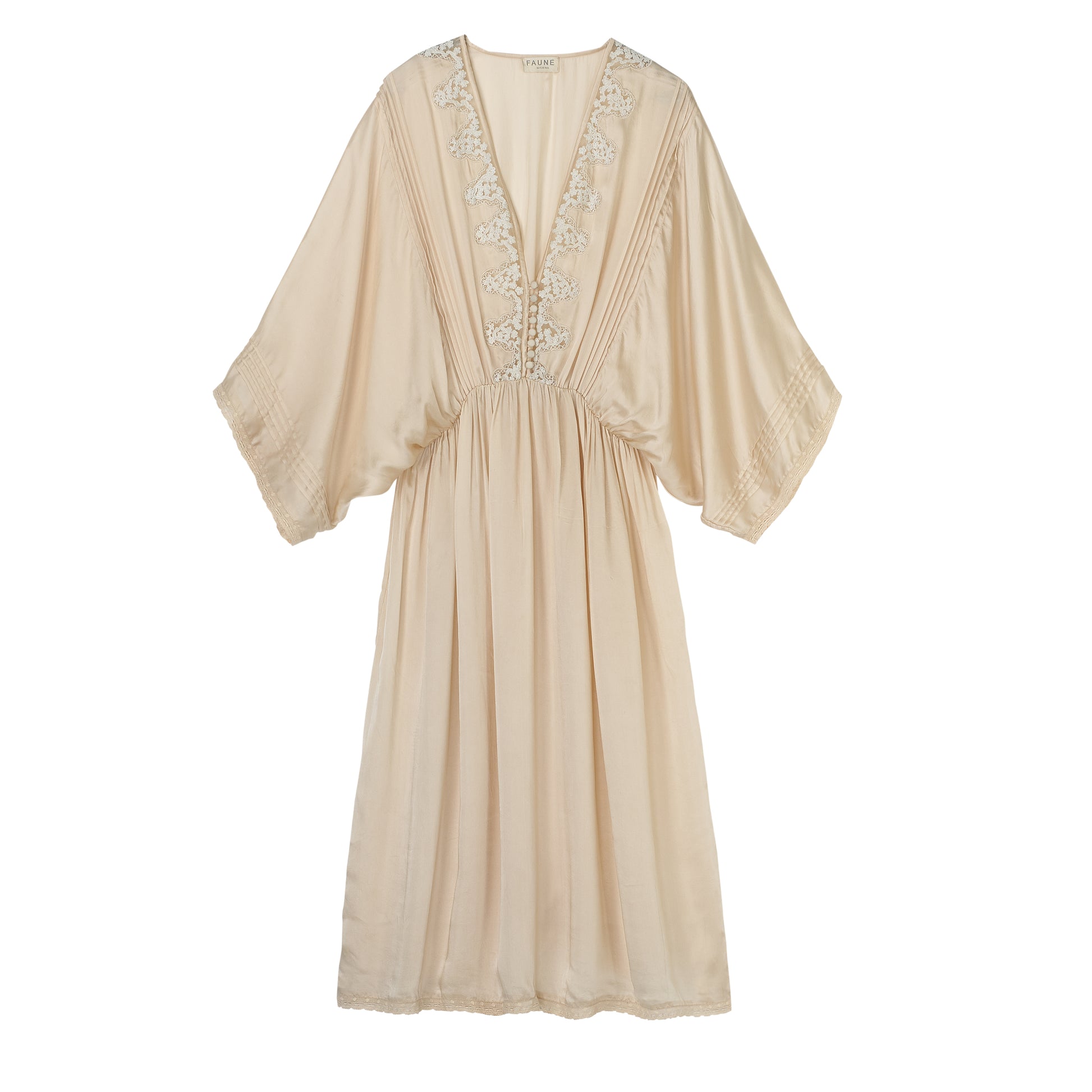 The Honeysuckle has an effortless silhouette that drapes beautifully thanks to its wide kimono sleeves and elasticated waist. As with all Faune designs, Honeysuckle has lots of vintage inspired details such as pin-tucks, pleats, lace, embroidery, and delicate covered buttons with a nod to the 1930's era. Made in silky modal satin this really is a very special piece. Honeysuckle is a truly luxurious nightgown which will without doubt add a touch of glamour to bedtimes. With lots of drape and the addition of side pockets, narrow elasticated waistband and wide kimono style sleeves its also a very easy, comfortable shape.