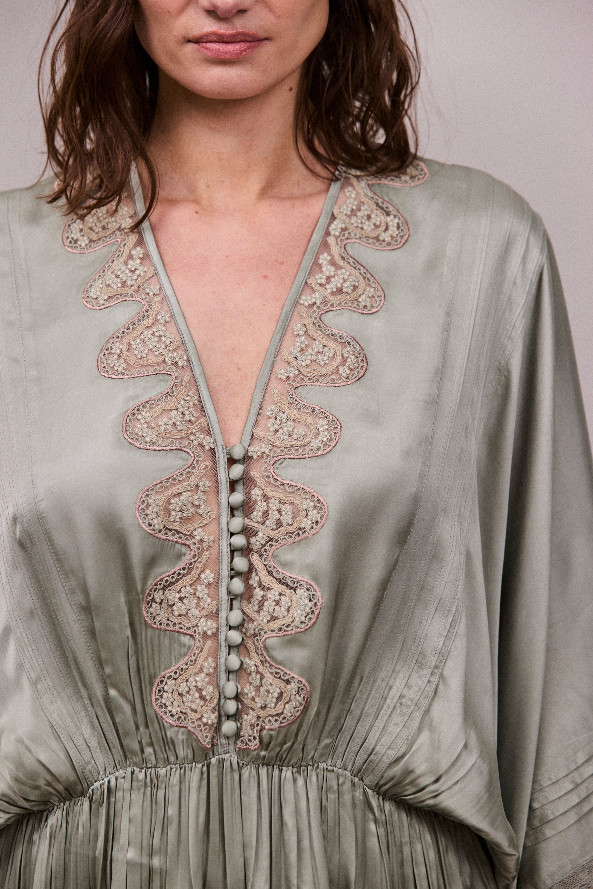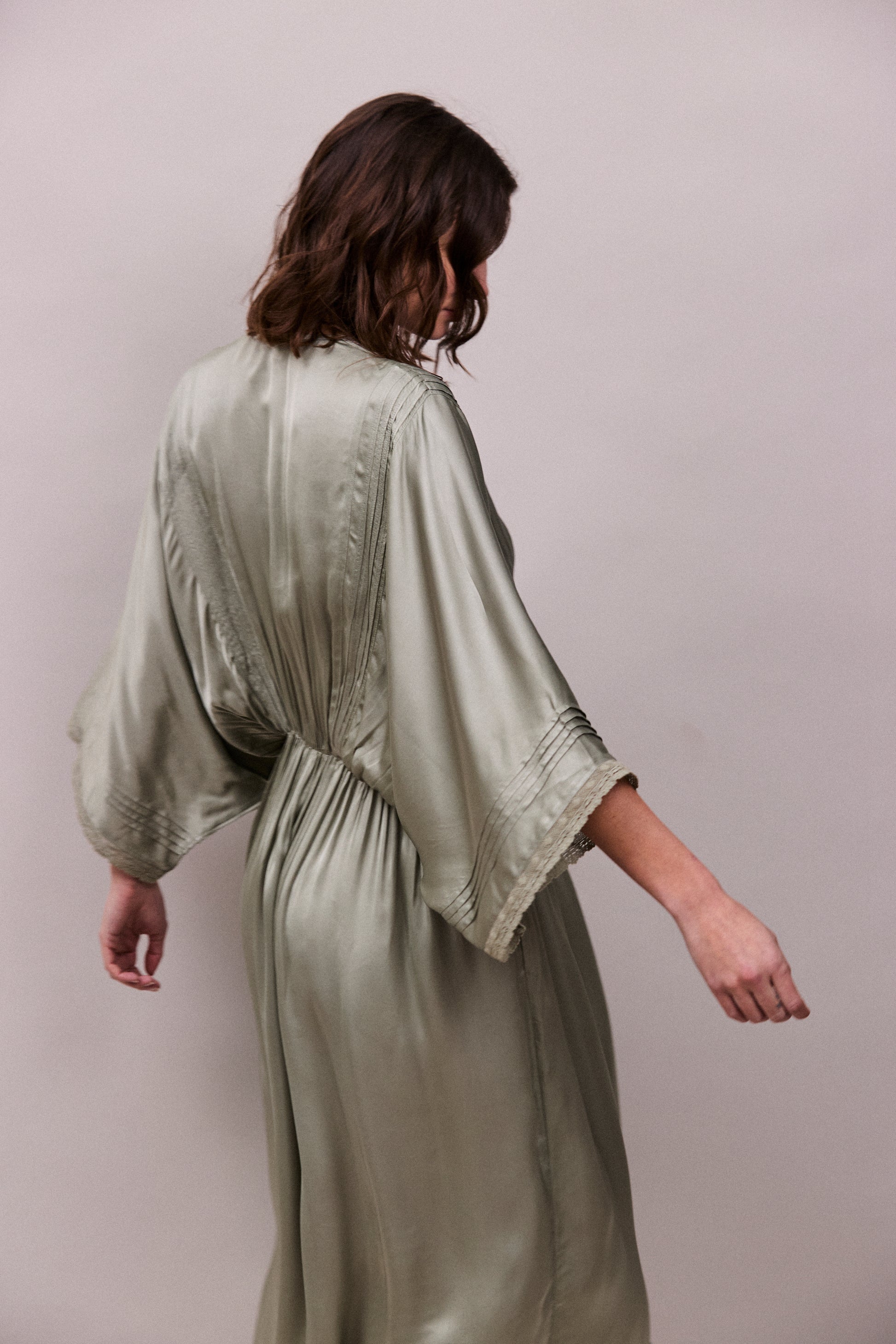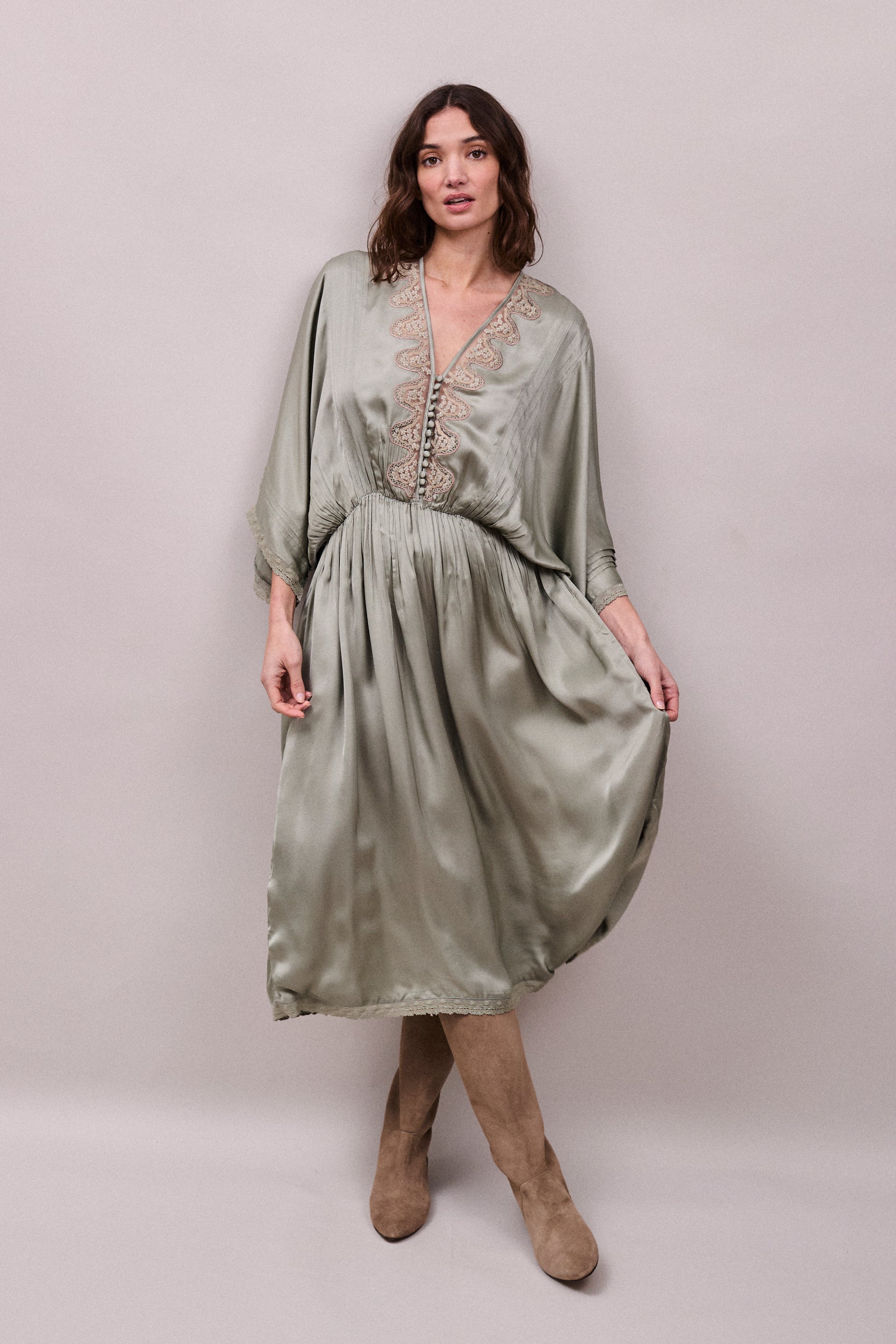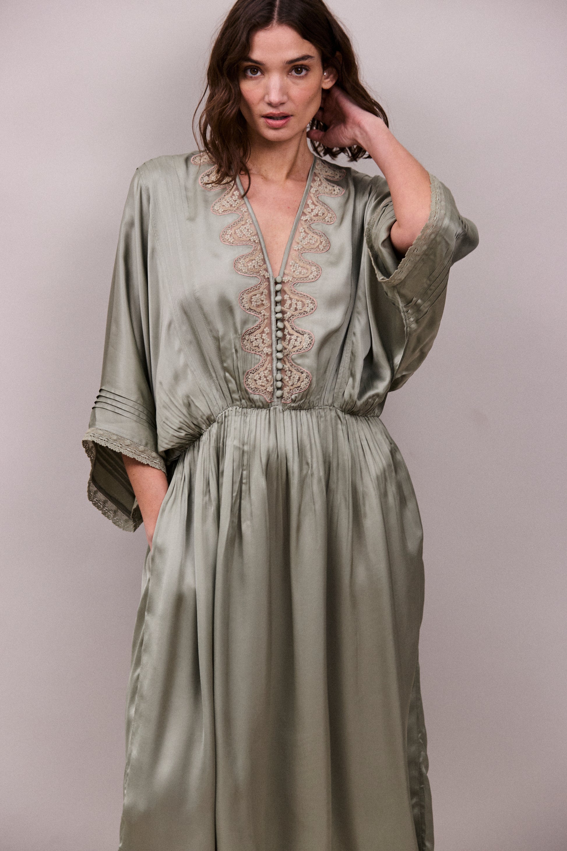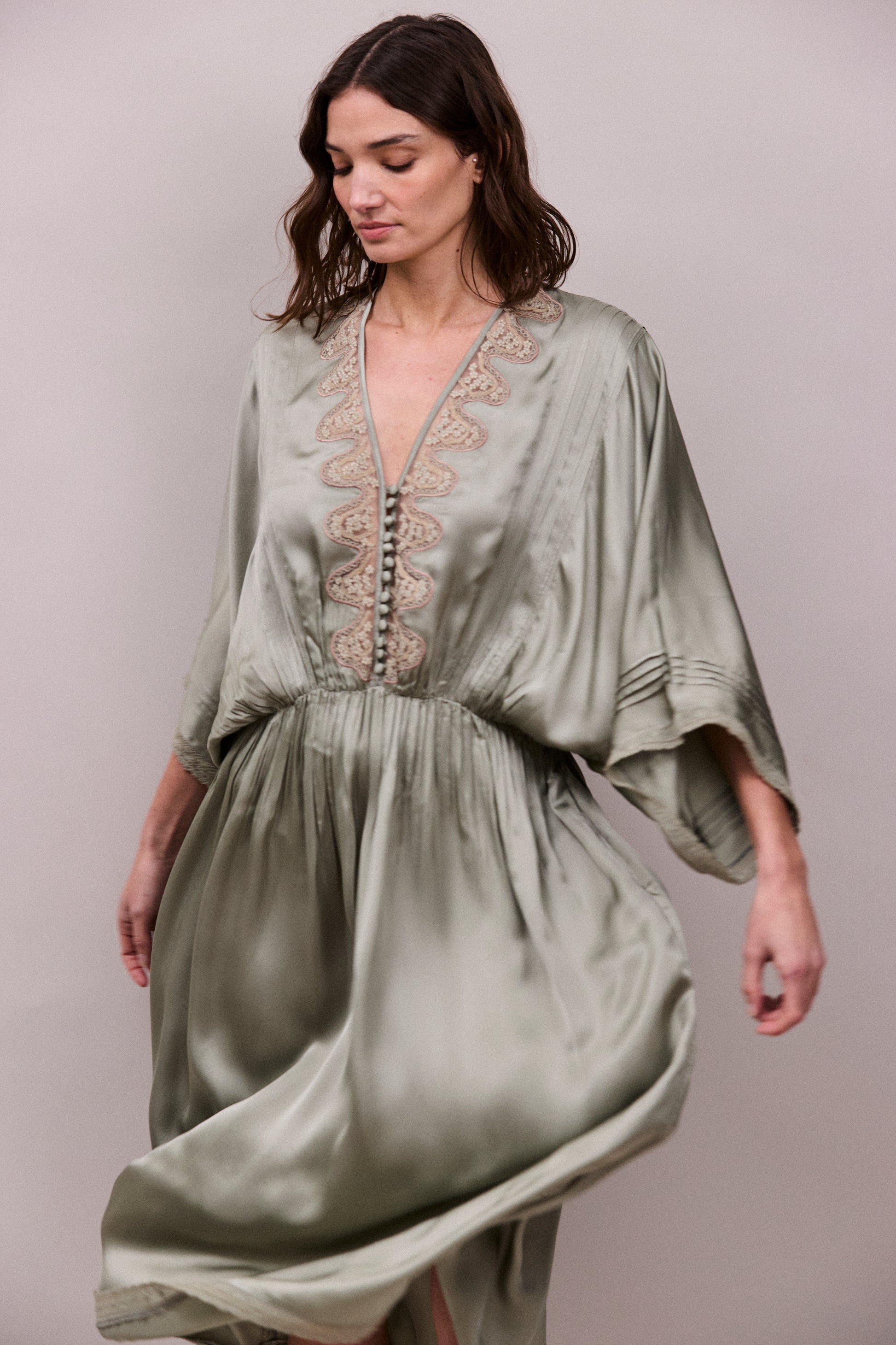 Crafted from fluid modal satin, the bestselling Honeysuckle dress returns in soft sage with a relaxed flowing silhouette, delicate hand-embroidered mesh lace at the neckline and gentle gathered volume through the skirt. Available in natural blush.