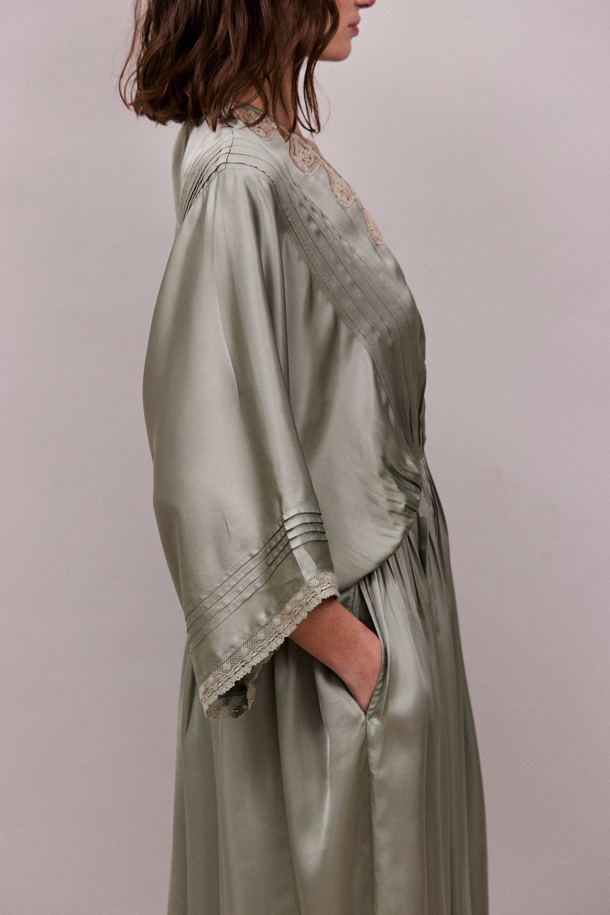The softly gathered waist creates a natural, flattering shape, while the loose, kimono-style sleeves fall effortlessly for an easy, unstructured feel. Delicate lace trims trace the neckline and front opening, finished with fabric-covered buttons that add a quiet vintage note — thoughtful details that elevate the simplicity of the shape.