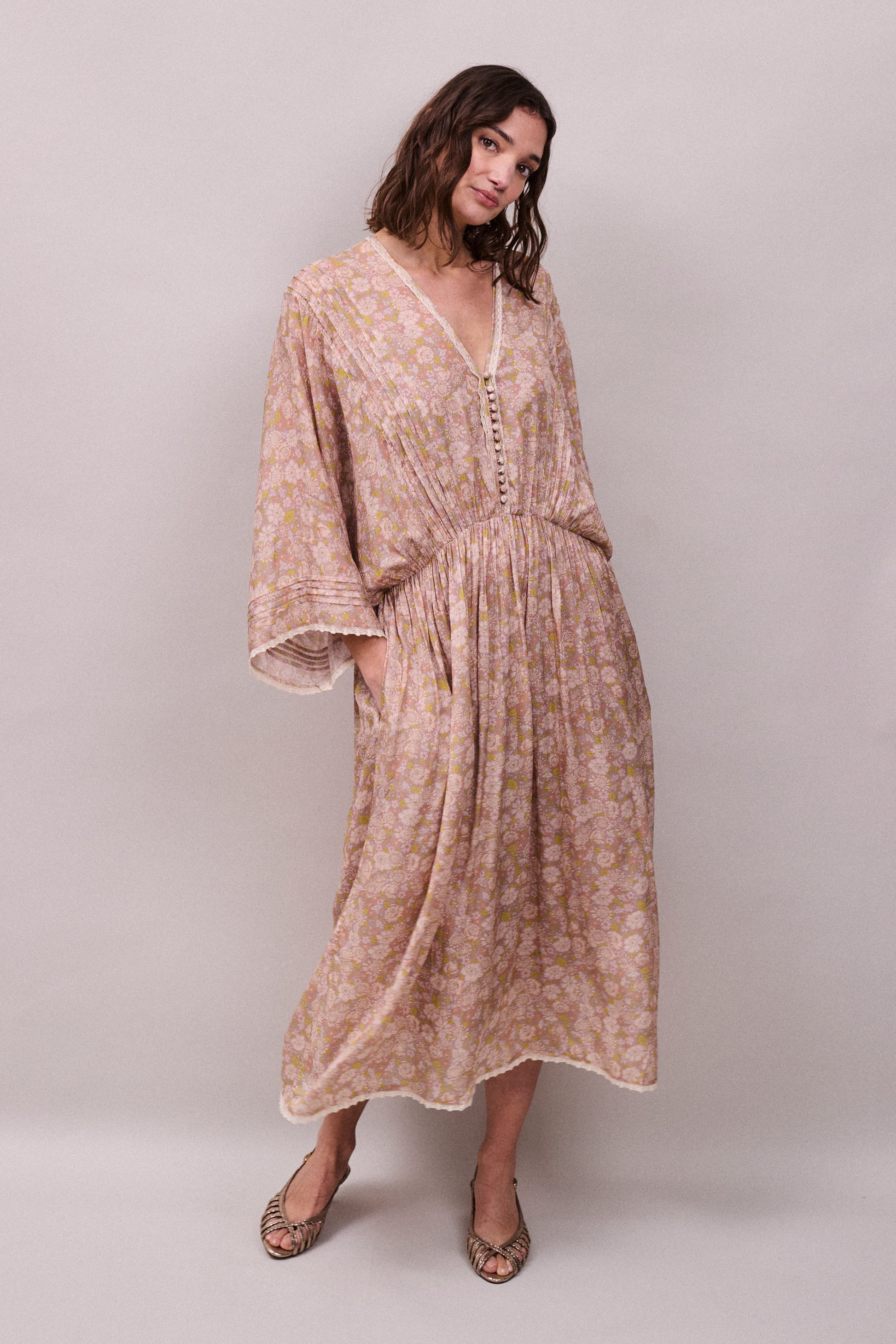 The Paloma dress is crafted from fluid viscose crepe in our vintage-inspired daisy print, bringing a soft nostalgic charm to the silhouette. Delicate pintuck detailing across the shoulders and waist creates gentle structure while allowing the fabric to fall beautifully through the skirt. The relaxed shape and flowing sleeves give the dress an easy elegance designed for everyday wear. Romantic yet effortless, it captures the quiet femininity at the heart of the Faune feeling.