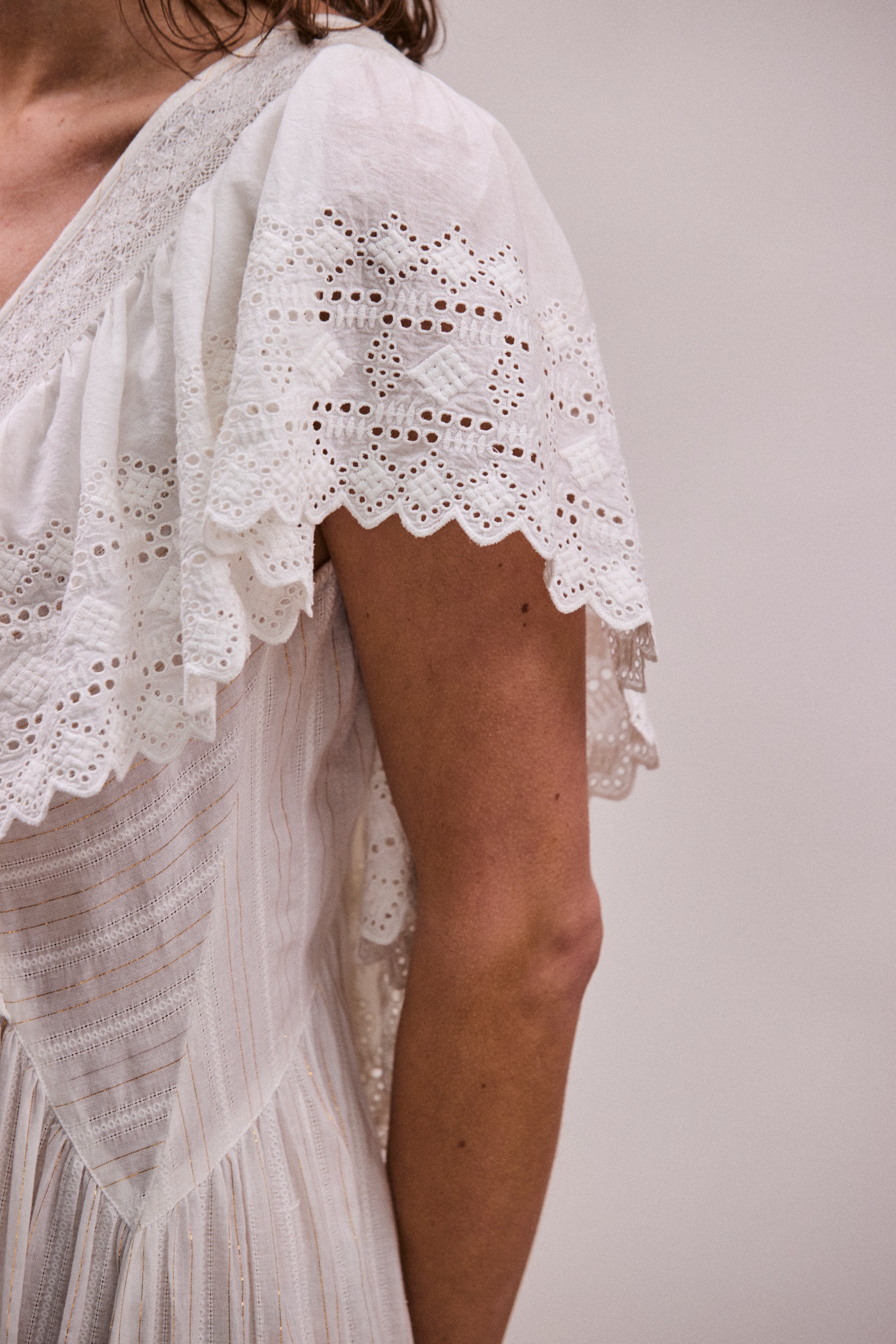 Made from textured cotton dobby woven with fine gold lurex threads, the Seville dress falls in a soft flowing silhouette with romantic vintage-inspired detailing.