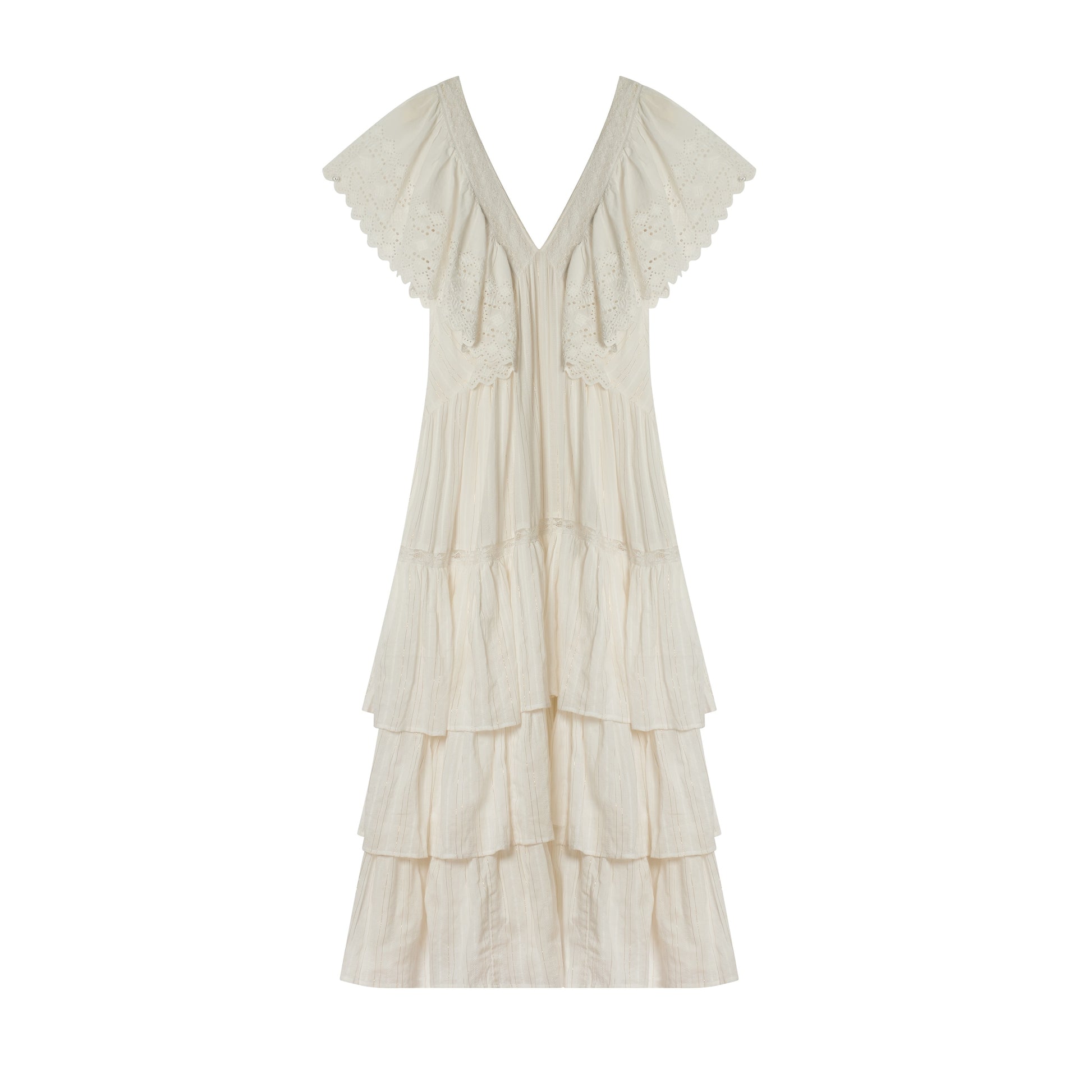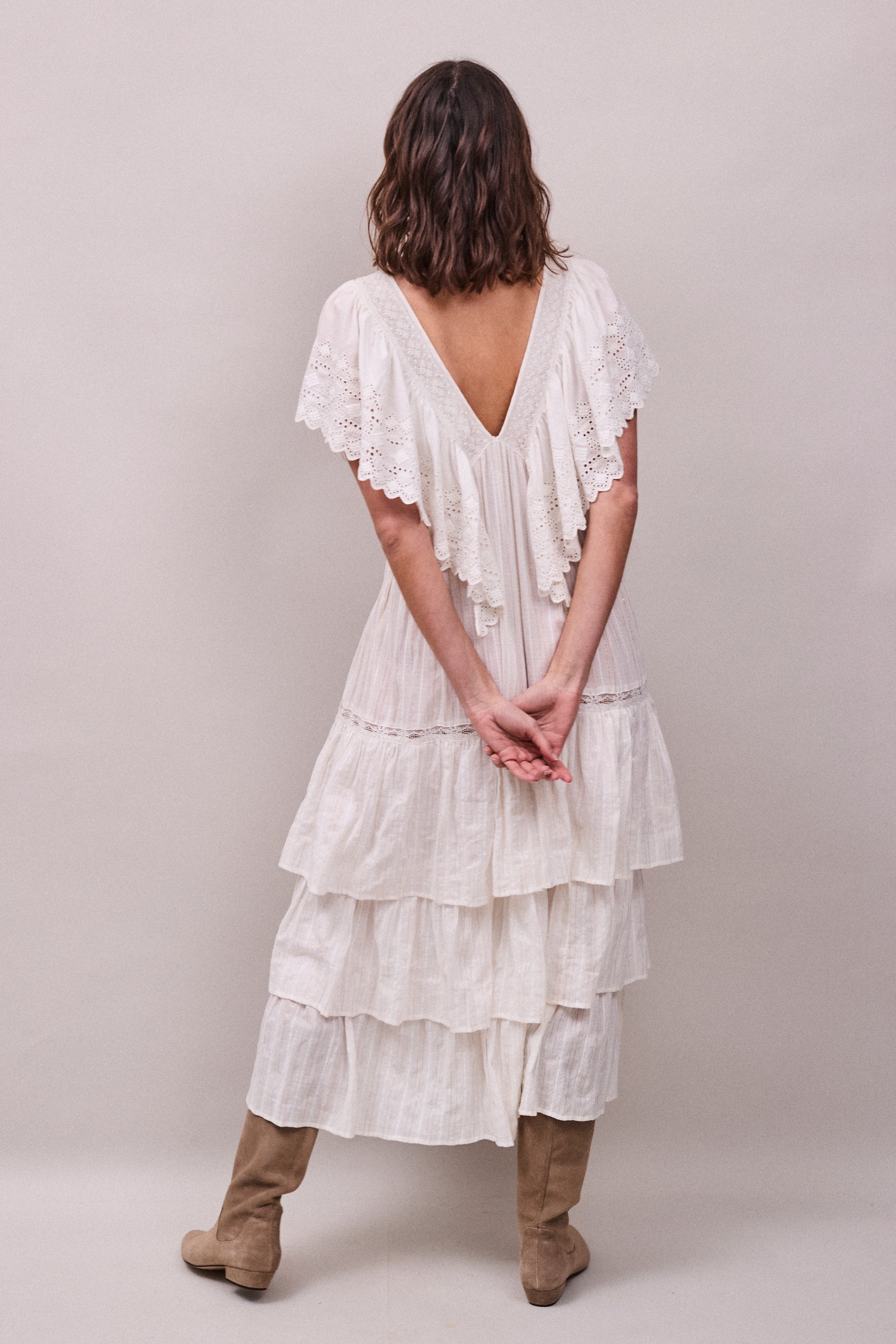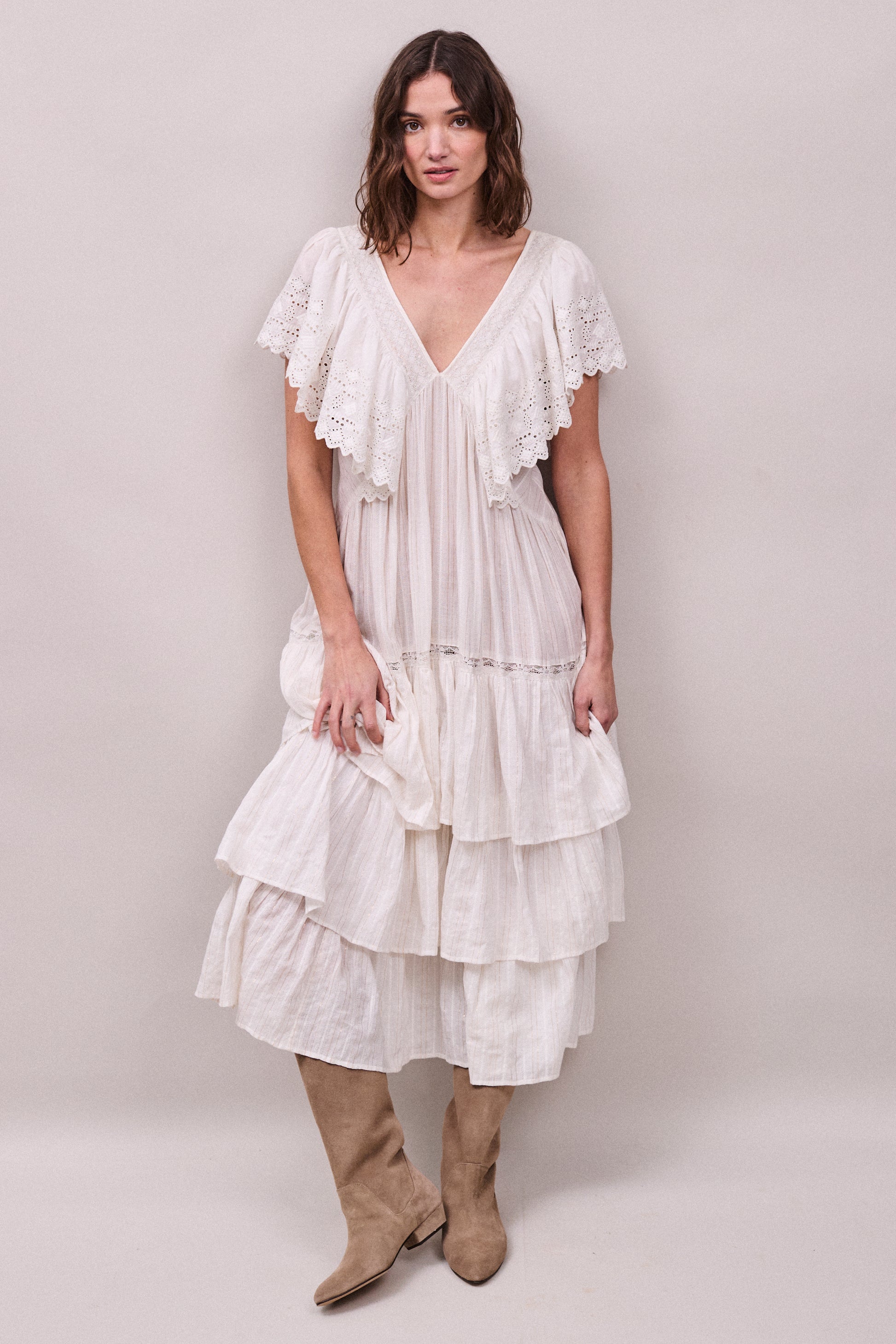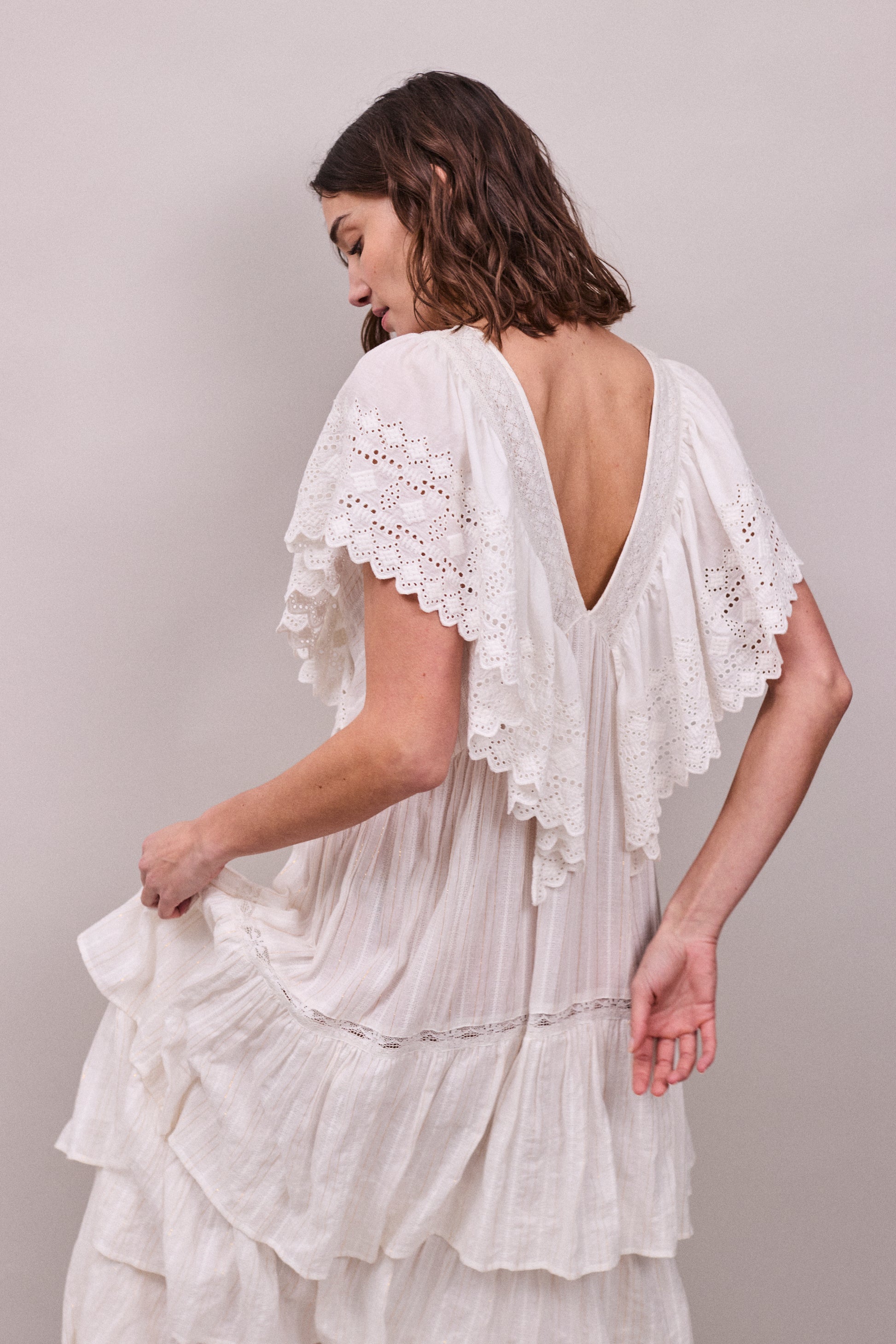 The Seville dress is crafted from softly textured cotton dobby woven with subtle gold lurex threads that catch the light within the delicate stripe of the fabric. Designed with a relaxed, flowing silhouette, it features a flattering V-neckline framed with broderie anglaise frill sleeves that cascade softly over the shoulders. Gentle gathers fall from the bodice into softly layered tiers, creating movement and lightness through the skirt. Romantic yet effortless, the Seville dress captures the spirit of antique-inspired dressing with a modern sense of ease.