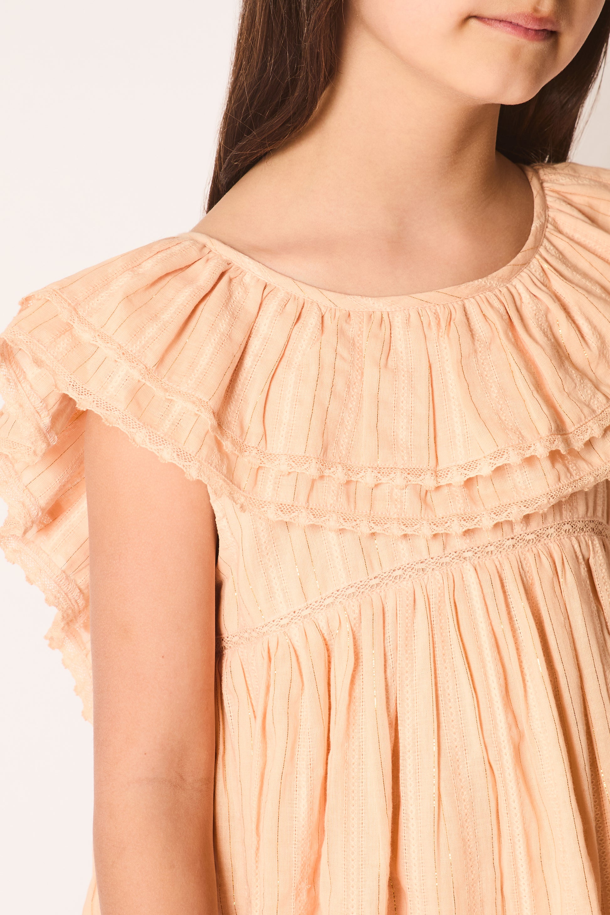 - Lace trims and pleats at hem