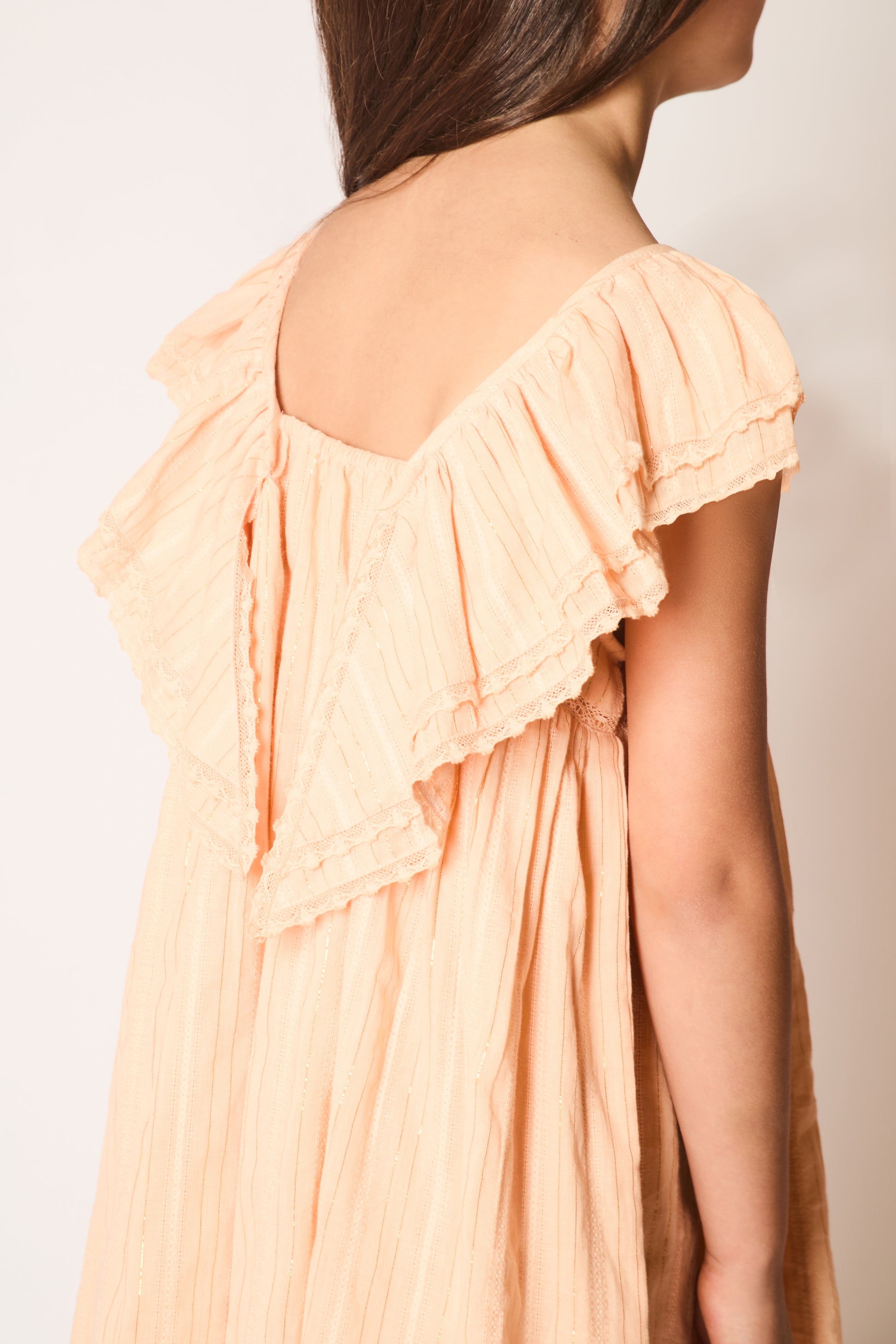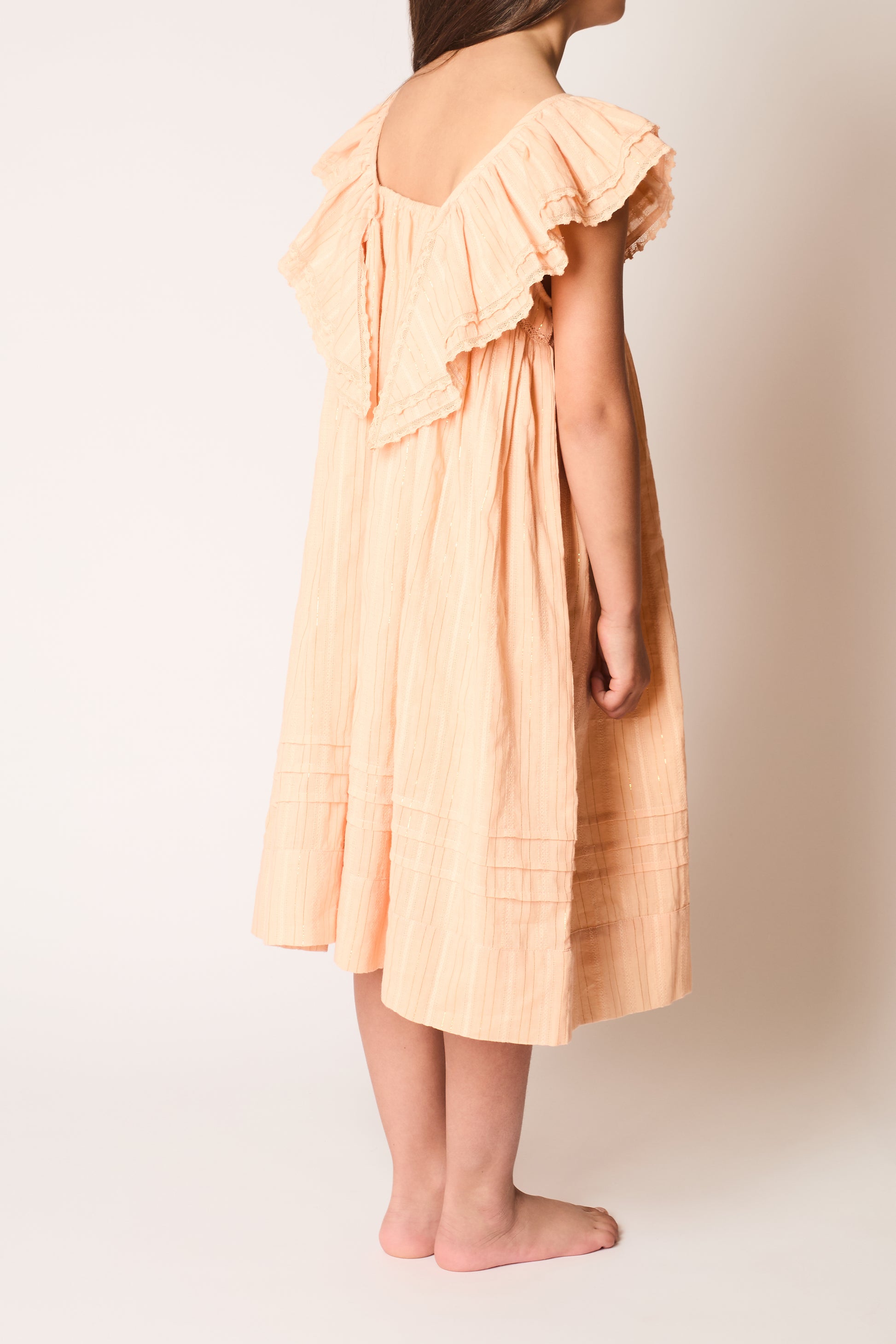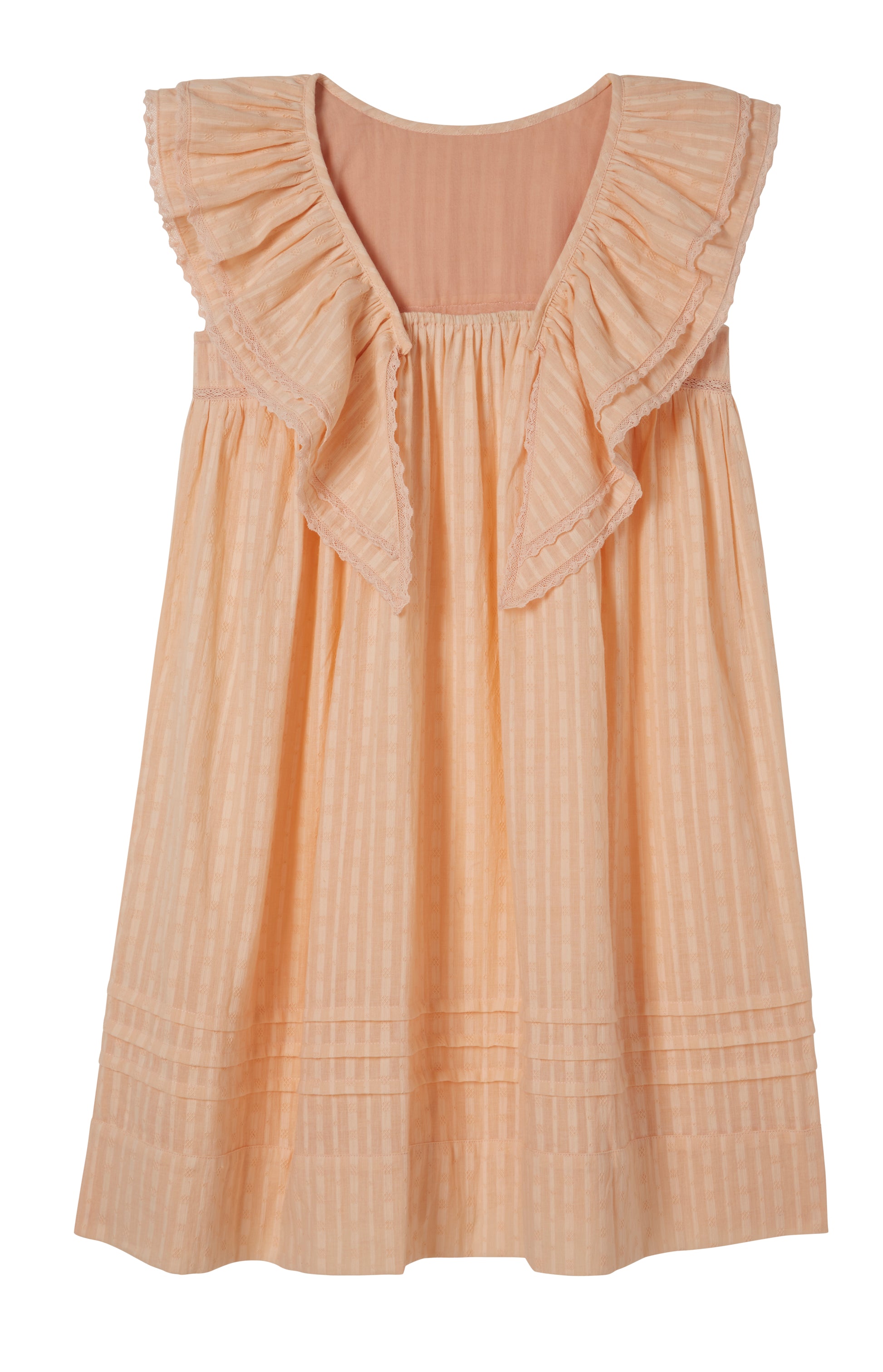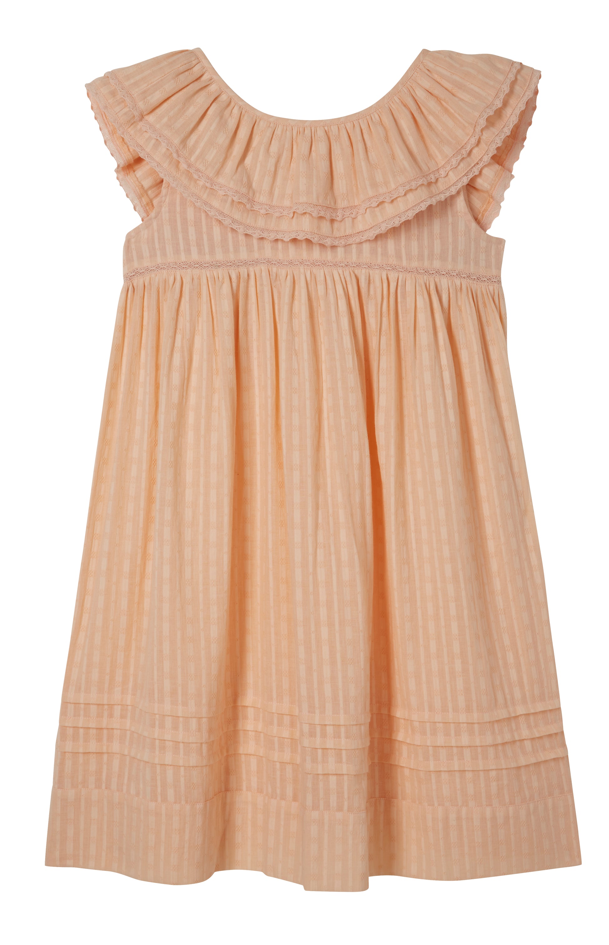 A beautiful take on our iconic embroidered Wren dress, this version also showcases our stunning 'wings' design across the back. Crafted from soft, textured striped cotton in our fresh new pink shade. Finished with delicate lace-trimmed wings and our signature pleated hem. Elastic at the back makes this an easy dress to pull on and off. This dress is fully lined for extra coverage.